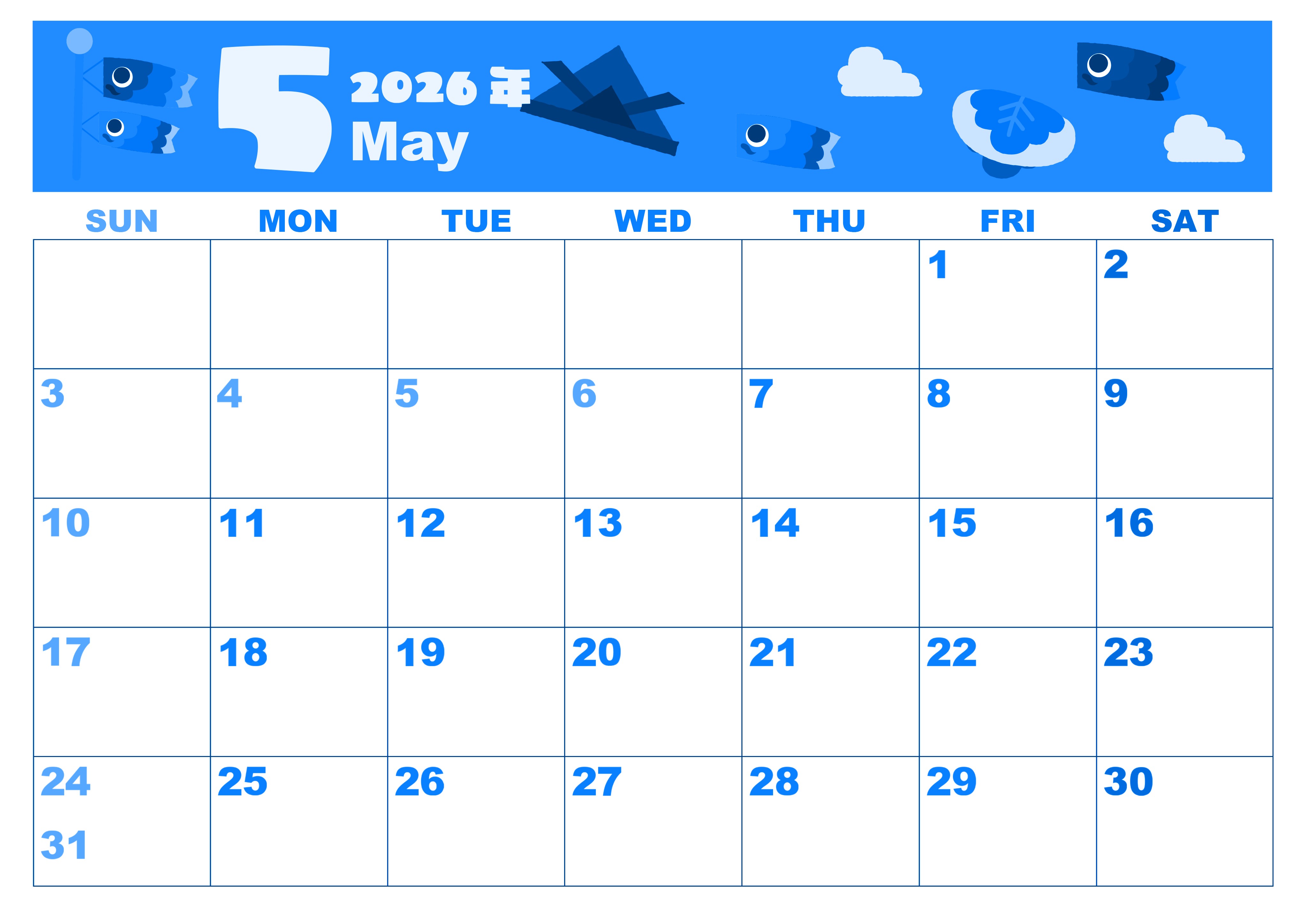 2026年5月横型日曜始まりの無料テンプレートブルーのカレンダーです。躍動感のある鯉のぼりや柏餅や兜といった5月の行事にちなんだコンテンツのイラストが盛り込まれたかわいいイラストブルーのカレンダーです。(2026-00860500)