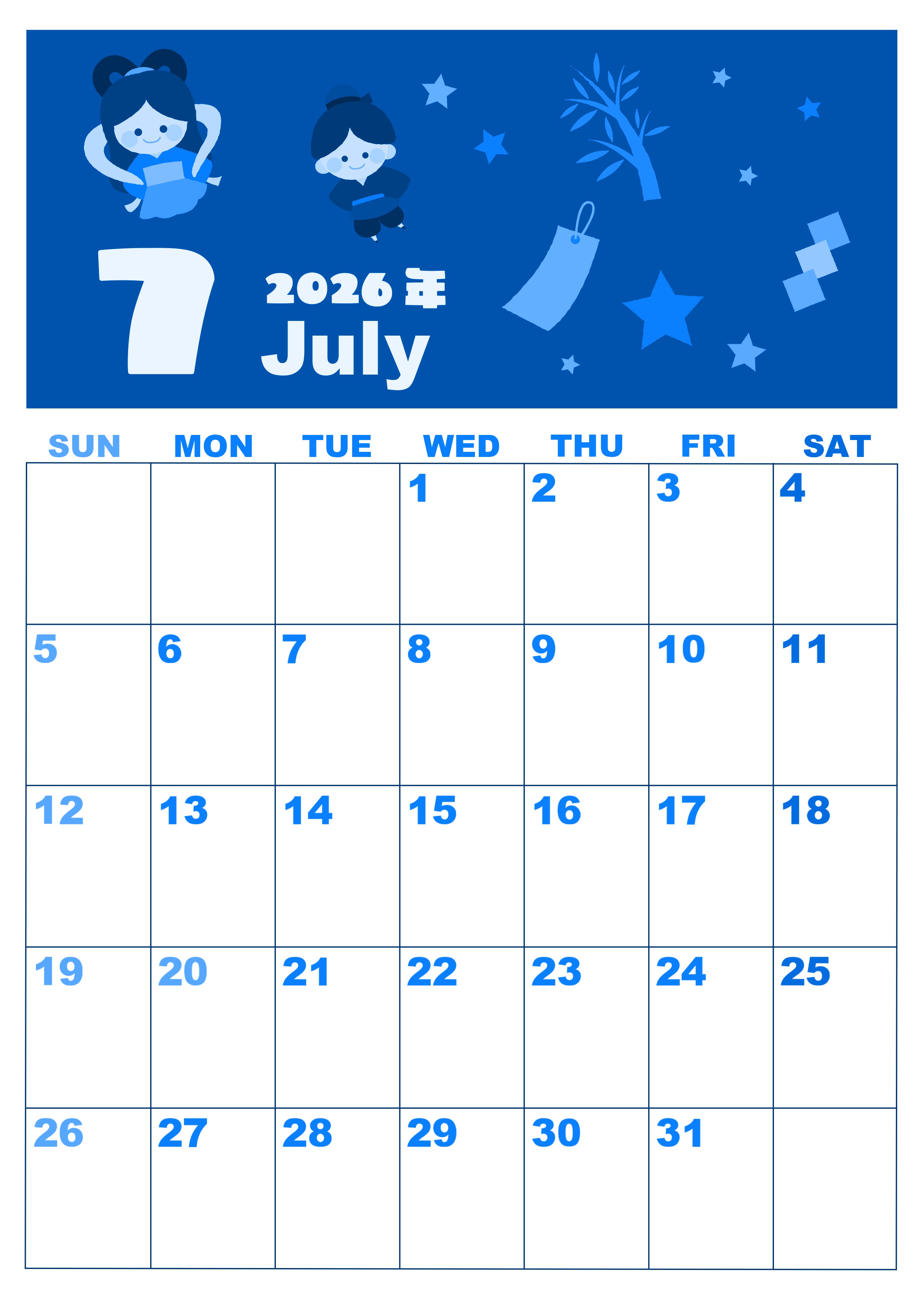 2026年7月縦型日曜始まりの無料テンプレートブルーのカレンダーです。織姫と彦星だけでなく七夕で使われる短冊といろいろなアイテムが描かれている遊び心に溢れたかわいいイラストが目を引く使うのが楽しくなるブルーのカレンダーです。(2026-00860710)