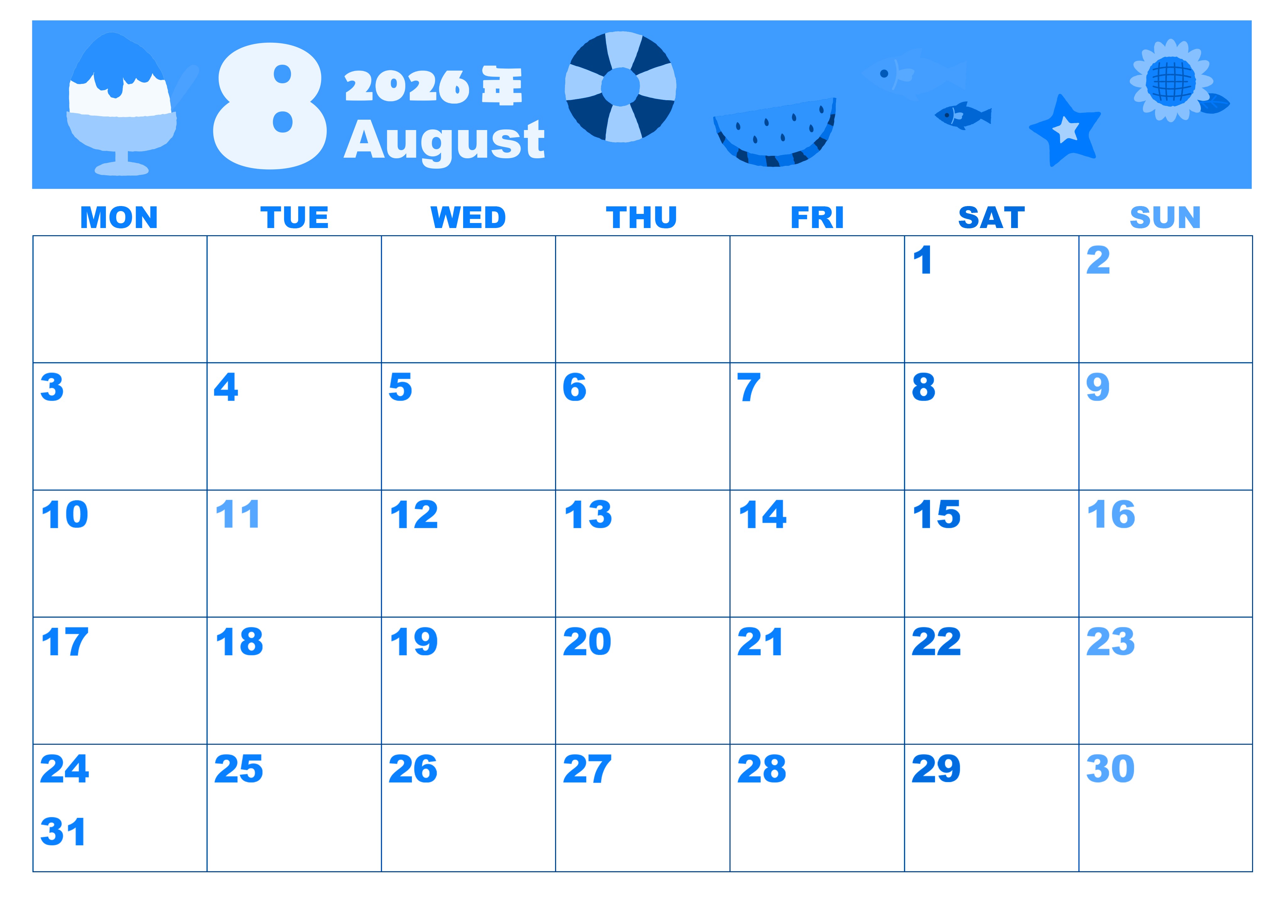 2026年8月横型月曜始まりの無料テンプレートブルーのカレンダーです。月曜始まりで利便性の高いブルーのカレンダー素材は無料で使えます。白く大きな数字の文字がまるっこくてかわいいです。イラストは夏休みがテーマです。(2026-00860801)