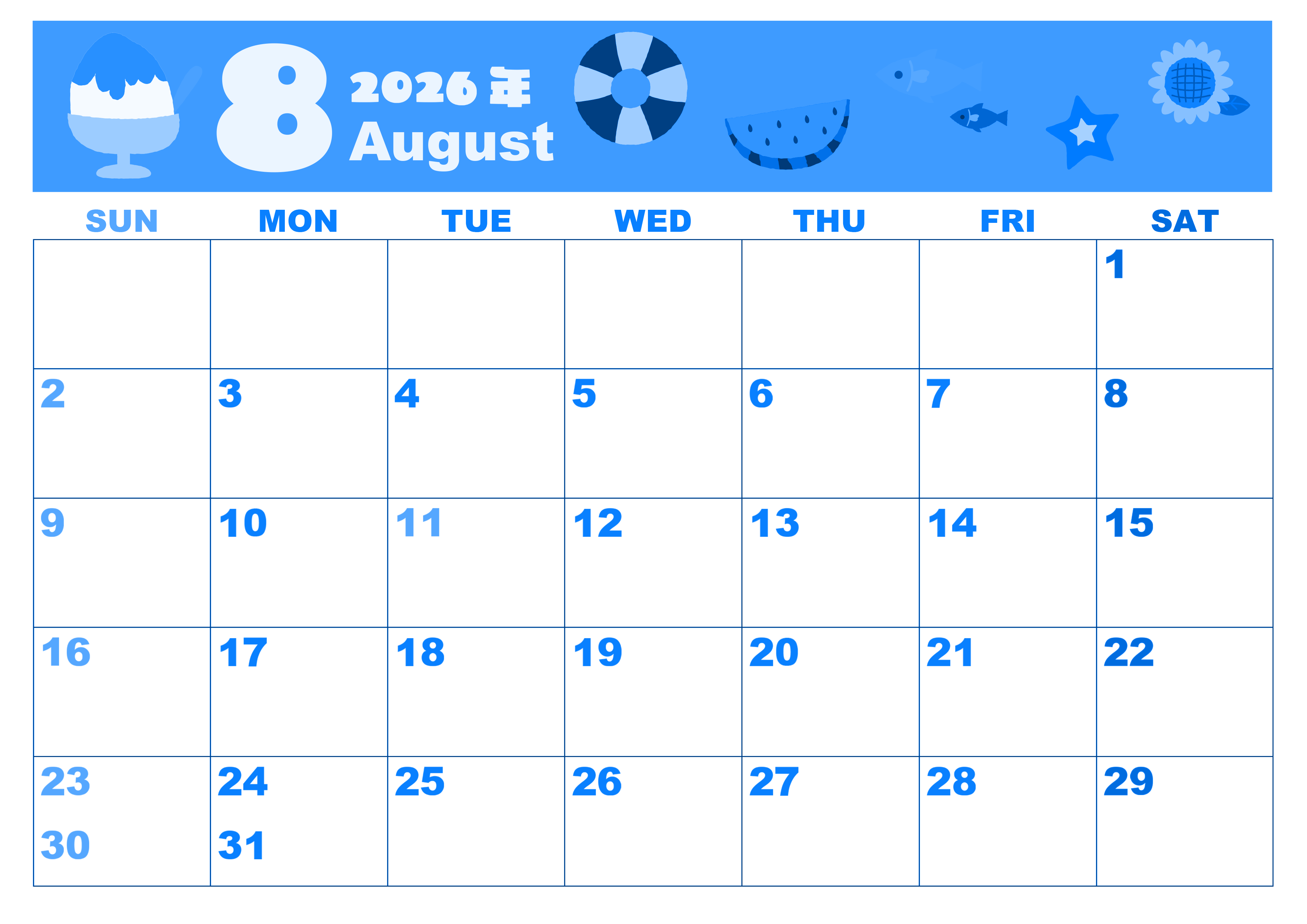 2026年8月横型日曜始まりの無料テンプレートブルーのカレンダーです。ぽってりとした8月の文字が存在感があってかわいい夏休みをテーマにしたポップイラストブルーのカレンダーです。A4サイズで無料にてお使い頂けます。(2026-00860800)