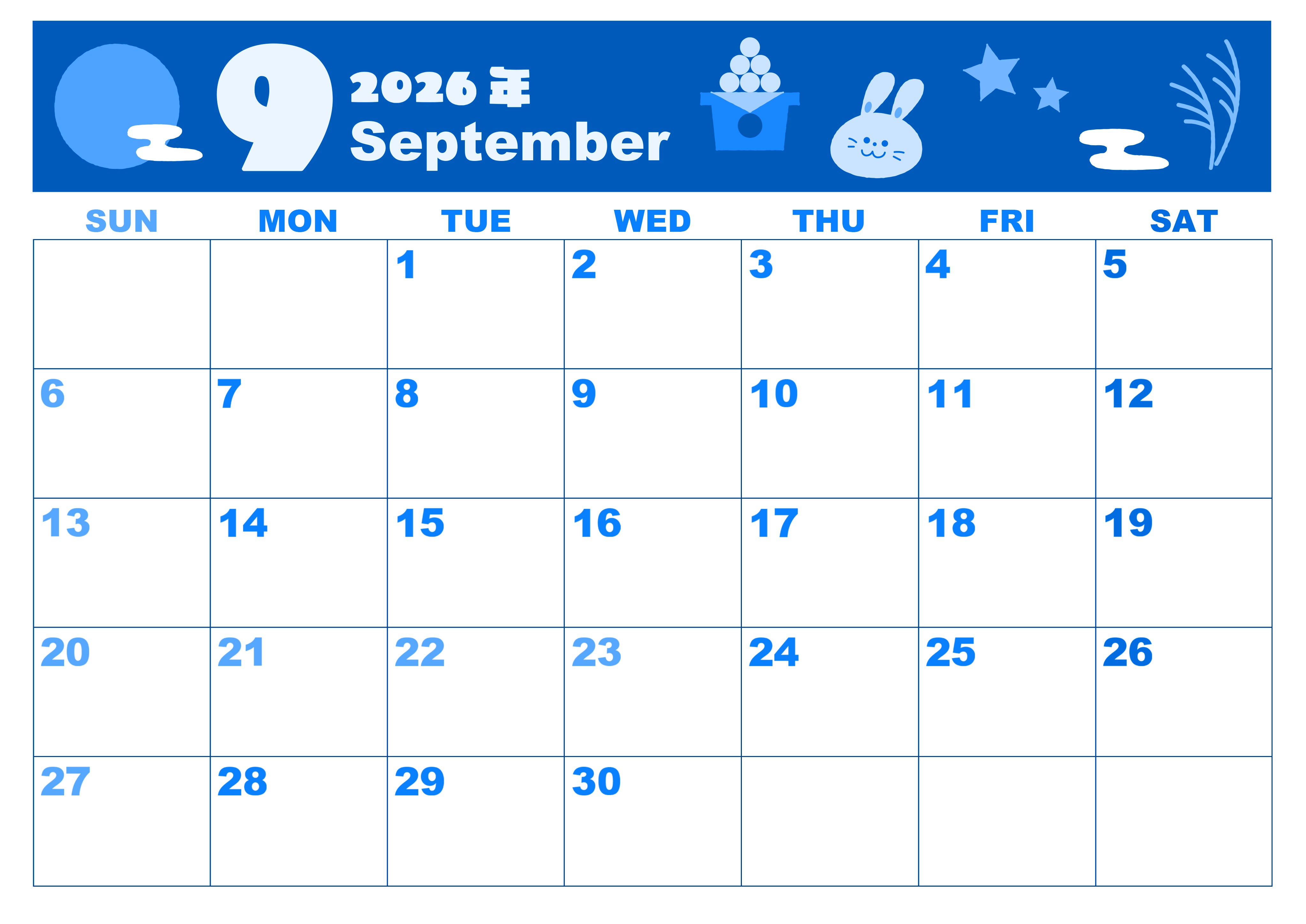 2026年・無料のカレンダーテンプレート 2026年9月横型日曜始まり お月見イラストのかわいいA4無料ブルーのカレンダー(2026-00860900) 素材状デザイン王 2025年4月4日 2026年9月横型日曜始まりの無料テンプレートブルーのカレンダーです。ぷにゅっとした「9月」の文字が存在感がありながらもとってもかわいいフォントです。お月見のイラストにもかわいいが詰まっています。(2026-00860900) 9月 横型のカレンダー 日曜始まり ブルー カレンダーデザイン-0086