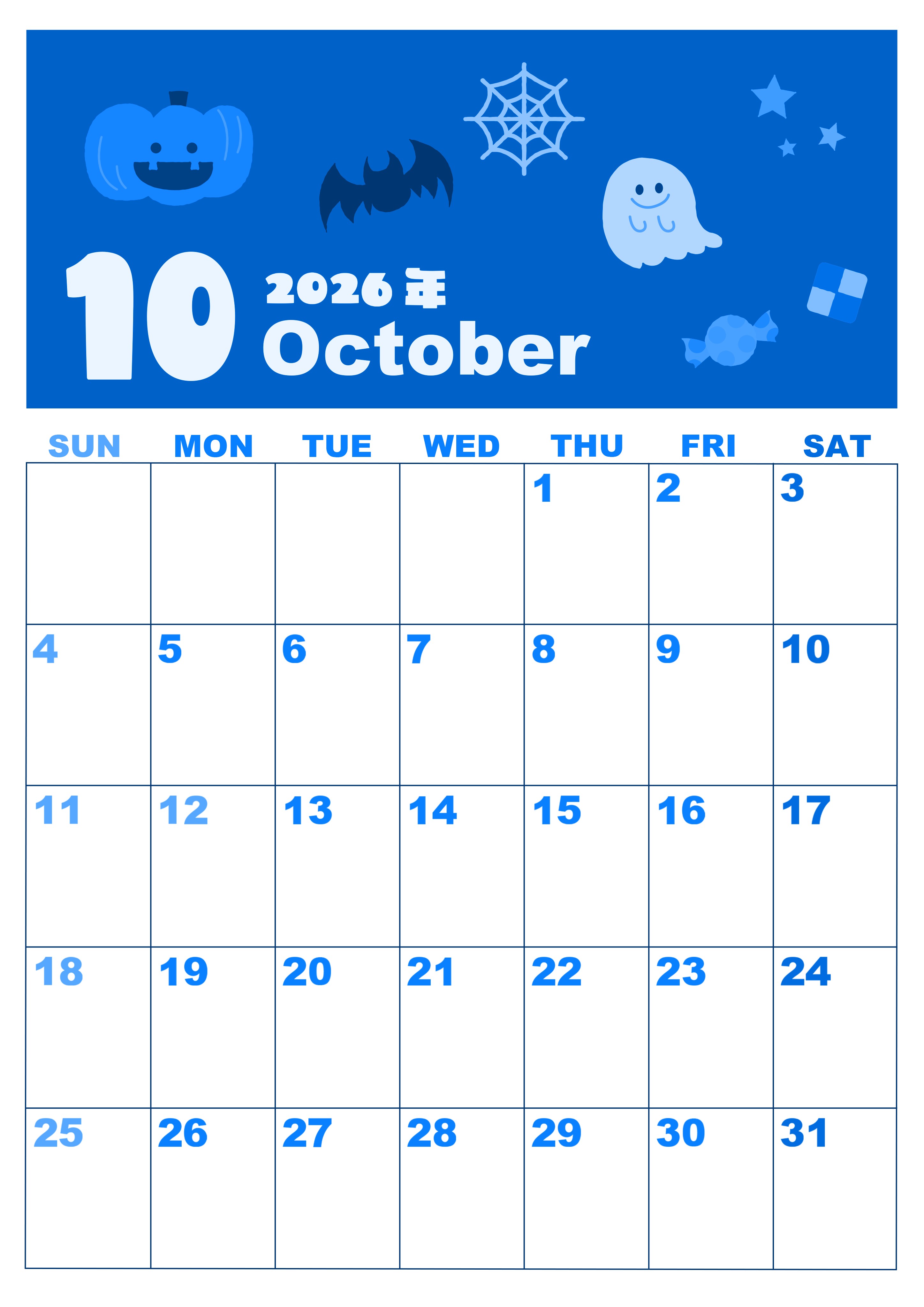 2026年・無料のカレンダーテンプレート 2026年10月縦型日曜始まり お菓子イラストのかわいいA4無料ブルーのカレンダー(2026-00861010) 素材状デザイン王 2025年4月4日 2026年10月縦型日曜始まりの無料テンプレートブルーのカレンダーです。トリックオアトリート!お菓子をくれなきゃいたずらするぞ!ハロウィンをテーマにかわいいイラストを描き上げました。(2026-00861010) 10月 縦型のカレンダー 日曜始まり ブルー カレンダーデザイン-0086
