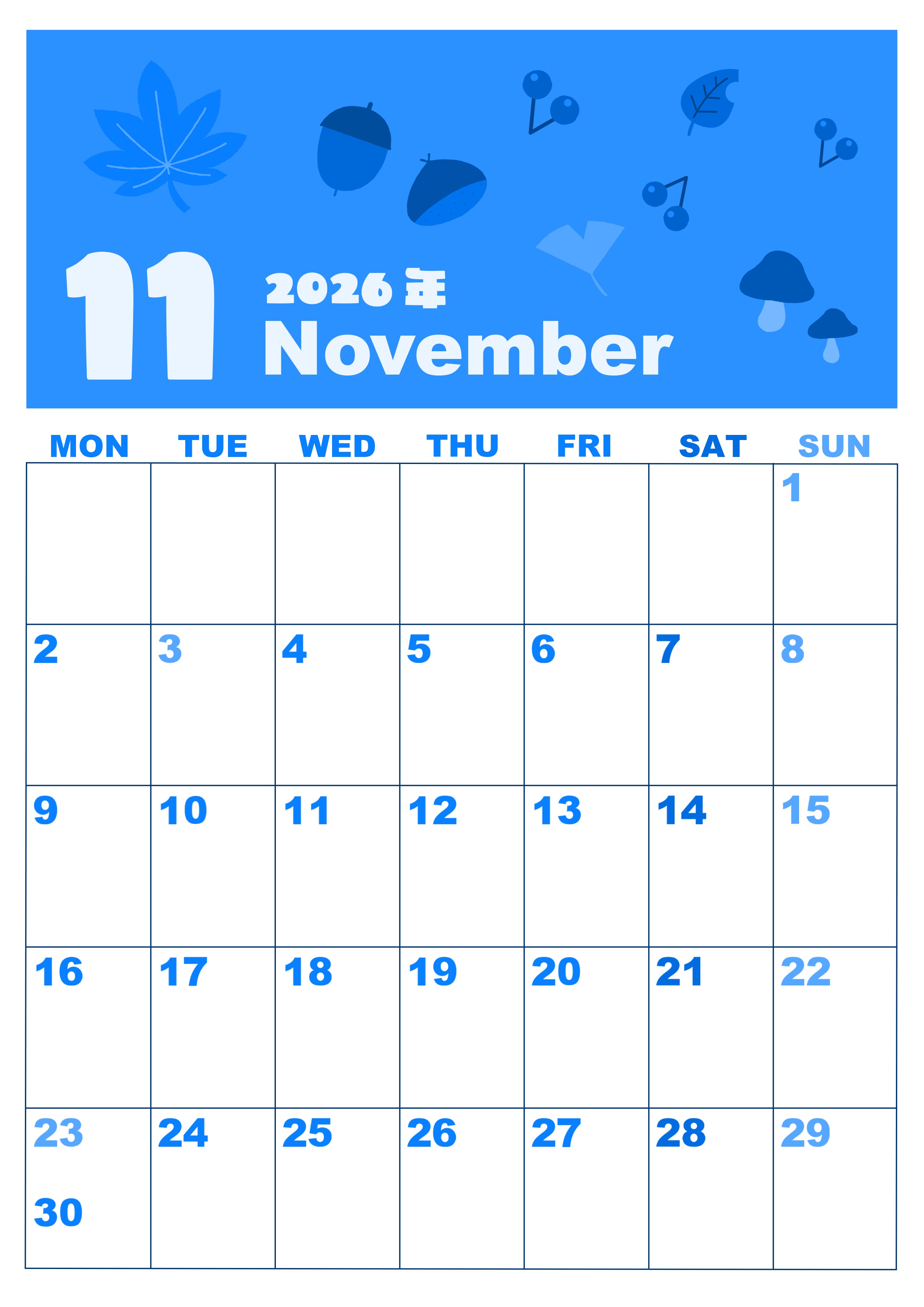 2026年11月縦型月曜始まりの無料テンプレートブルーのカレンダーです。どんぐりのイラストがかわいいので使うのが楽しくなるようなブルーのカレンダー素材です。ダウンロードは無料にて行えるので入手しやすいです。(2026-00861111)