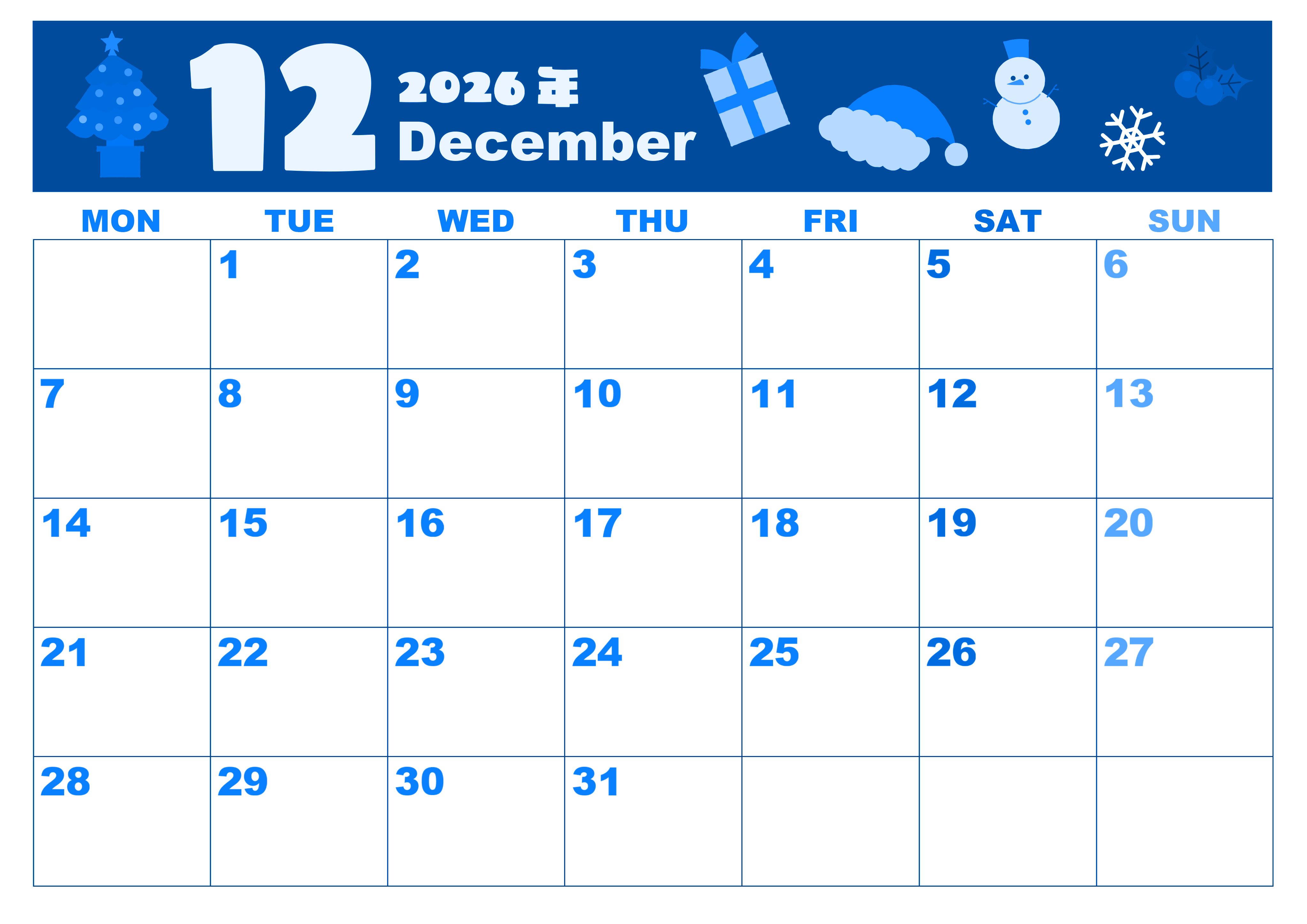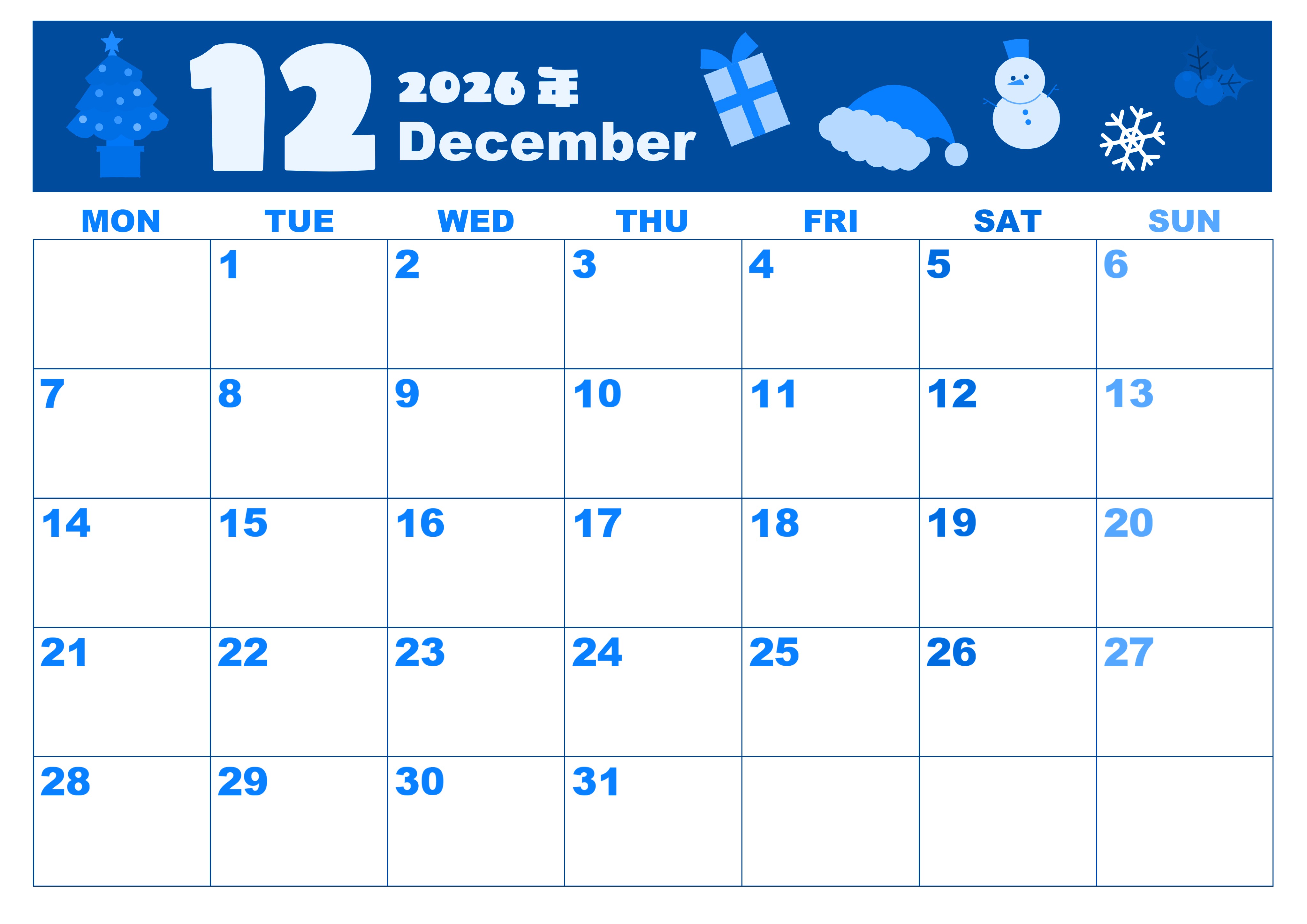 2026年12月横型月曜始まり 行事イラストのかわいいA4無料ブルーのカレンダー(2026-00861201)