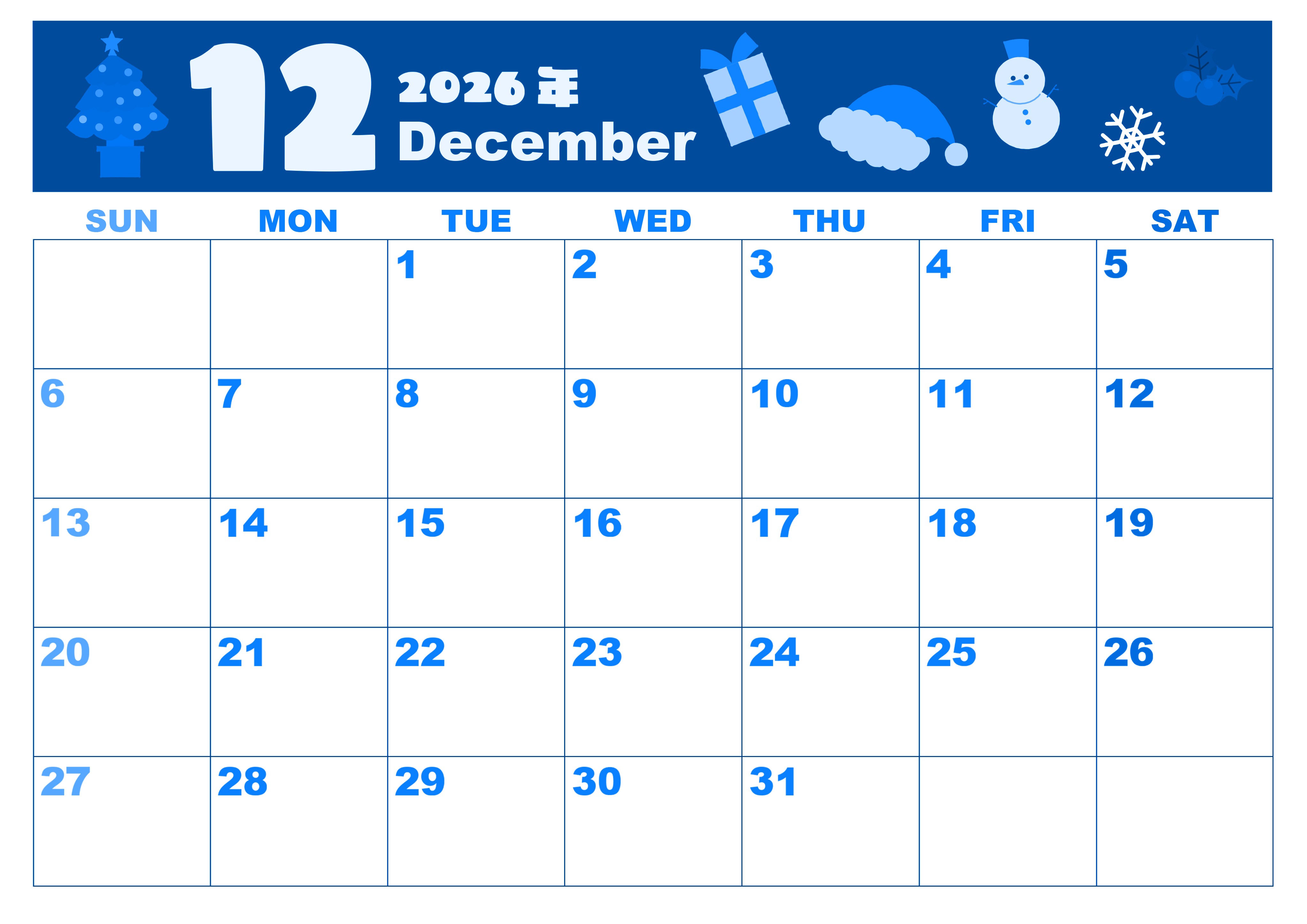 2026年・無料のカレンダーテンプレート 2026年12月横型日曜始まり 行事イラストのかわいいA4無料ブルーのカレンダー(2026-00861200) 素材状デザイン王 2025年4月4日 2026年12月横型日曜始まりの無料テンプレートブルーのカレンダーです。行事にまつわるアイテムがあちこちにちりばめられているかわいいイラストに仕上げました。フォントもかわいいところがおすすめです。(2026-00861200) 12月 横型のカレンダー 日曜始まり ブルー カレンダーデザイン-0086