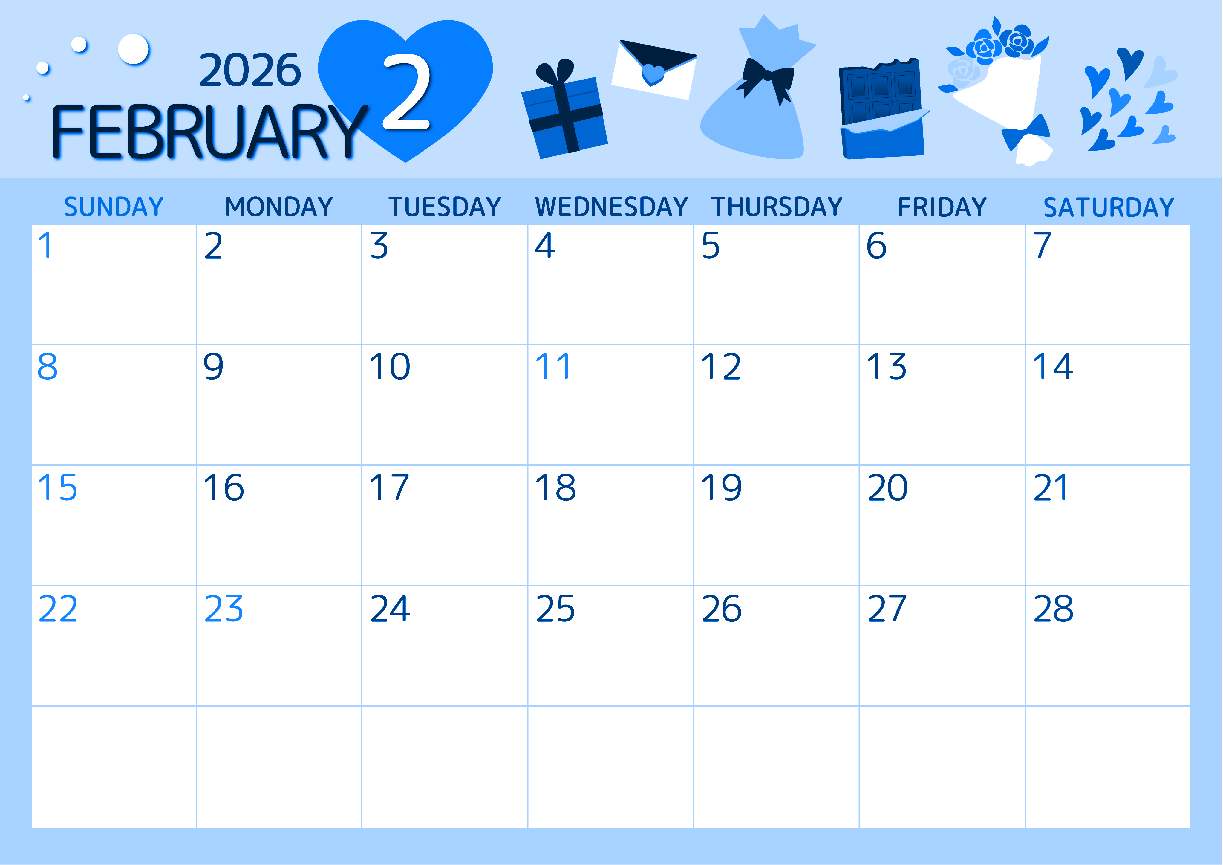 2026年・無料のカレンダーテンプレート 2026年2月横型日曜始まり プレゼントがかわいいイラストA4無料ブルーのカレンダー(2026-00870200) 素材状デザイン王 2025年4月4日 2026年2月横型日曜始まりの無料テンプレートブルーのカレンダーです。バレンタインのプレゼントが飛び出してくるようなウキウキがあふれるかわいいイラストのブルーのカレンダーテンプレートです。(2026-00870200) 2月 横型のカレンダー 日曜始まり ブルー カレンダーデザイン-0087