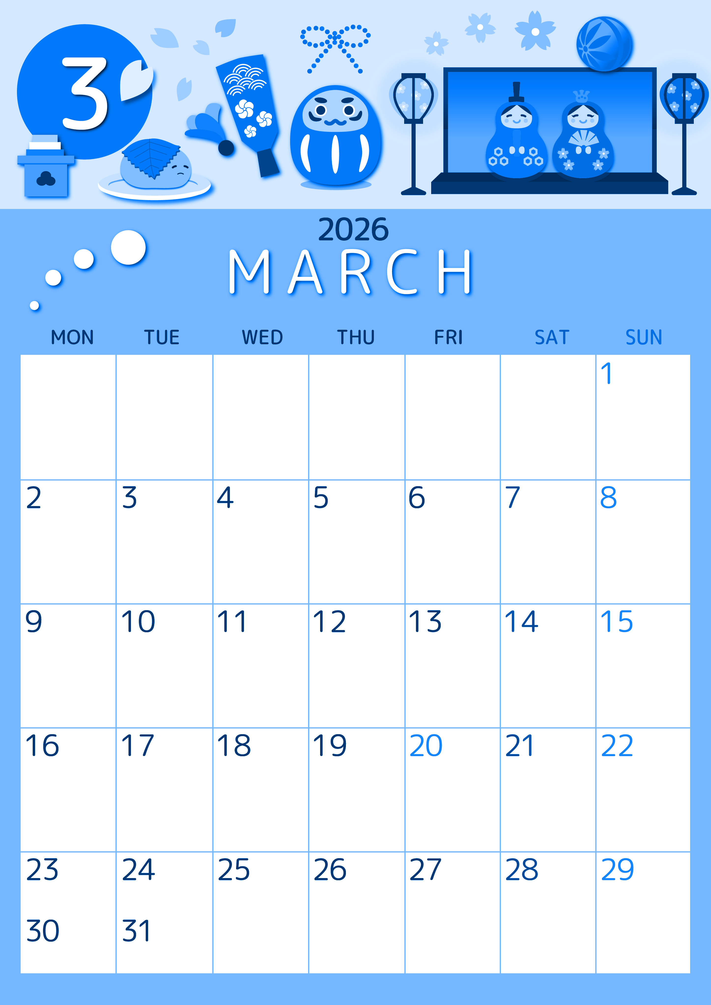 2026年・無料のカレンダーテンプレート 2026年3月縦型月曜始まり 桜花弁イラストのかわいいA4無料ブルーのカレンダー(2026-00870311) 素材状デザイン王 2025年4月4日 2026年3月縦型月曜始まりの無料テンプレートブルーのカレンダーです。月曜始まりのブルーのカレンダーしか使いたくないという人におすすめしたいシンプルでかわいいイラストテンプレートです。(2026-00870311) 3月 縦型のカレンダー 月曜始まり ブルー カレンダーデザイン-0087