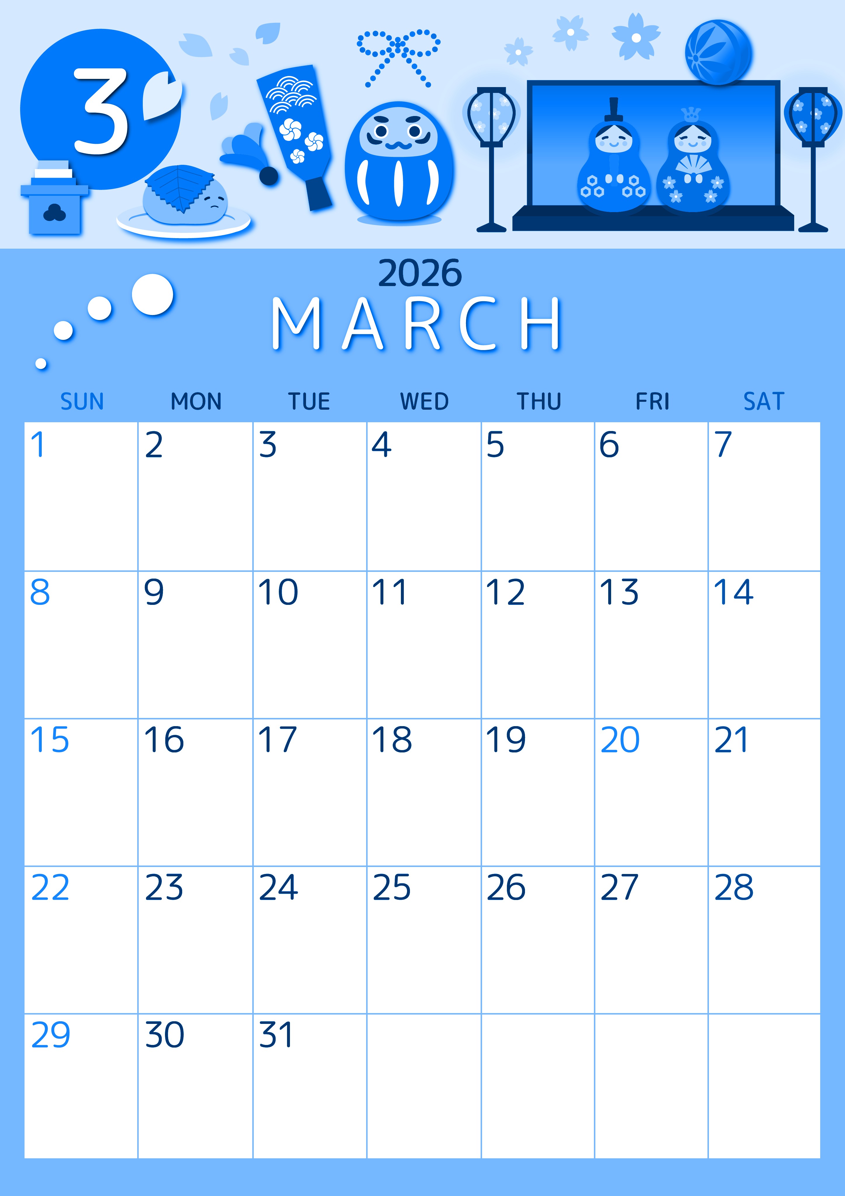 2026年3月縦型日曜始まりの無料テンプレートブルーのカレンダーです。スケジュール記入欄には色分けされている曜日が分かりやすい日付が印字されている使いやすいブルーのカレンダーです。イラストもシンプルかつかわいいものとなっています。(2026-00870310)
