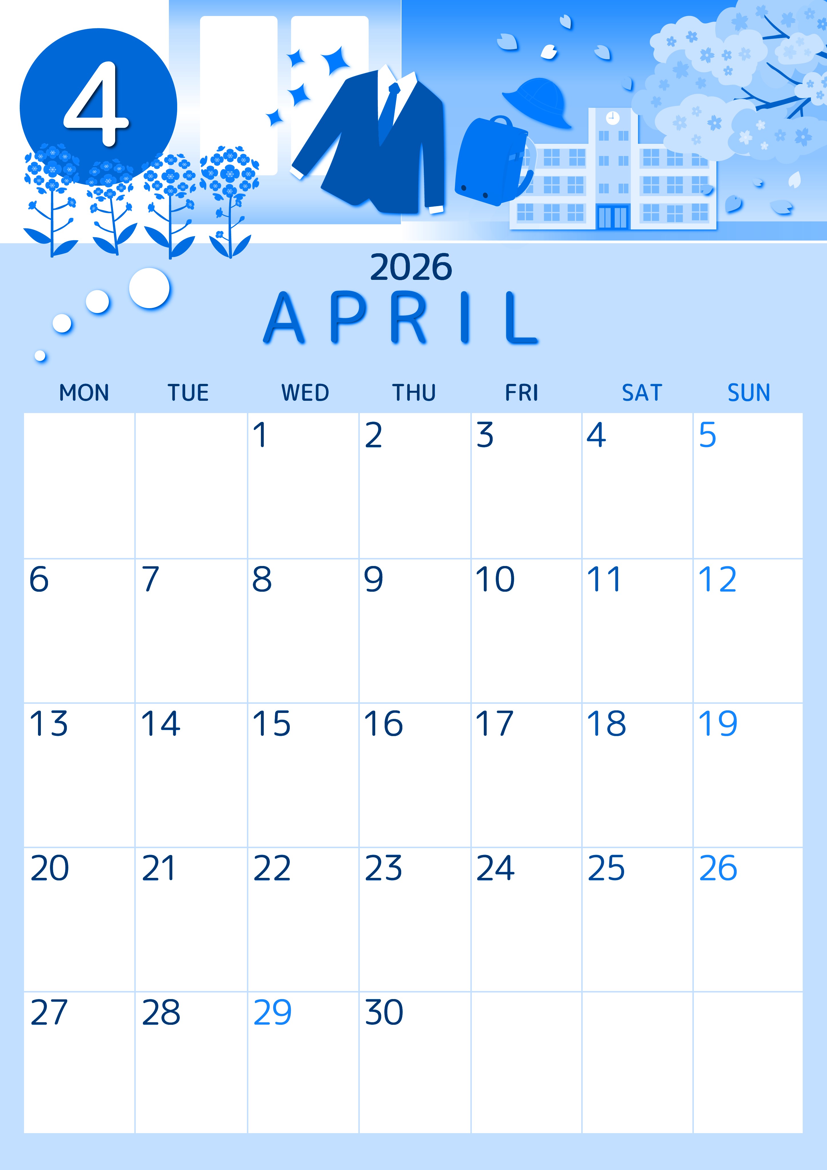 2026年4月縦型月曜始まりの無料テンプレートブルーのカレンダーです。緑を基調にしているブルーのカレンダーなので見やすいです。月曜始まりでダウンロードは無料です。入学式モチーフのイラストもかわいいのでおすすめです。(2026-00870411)