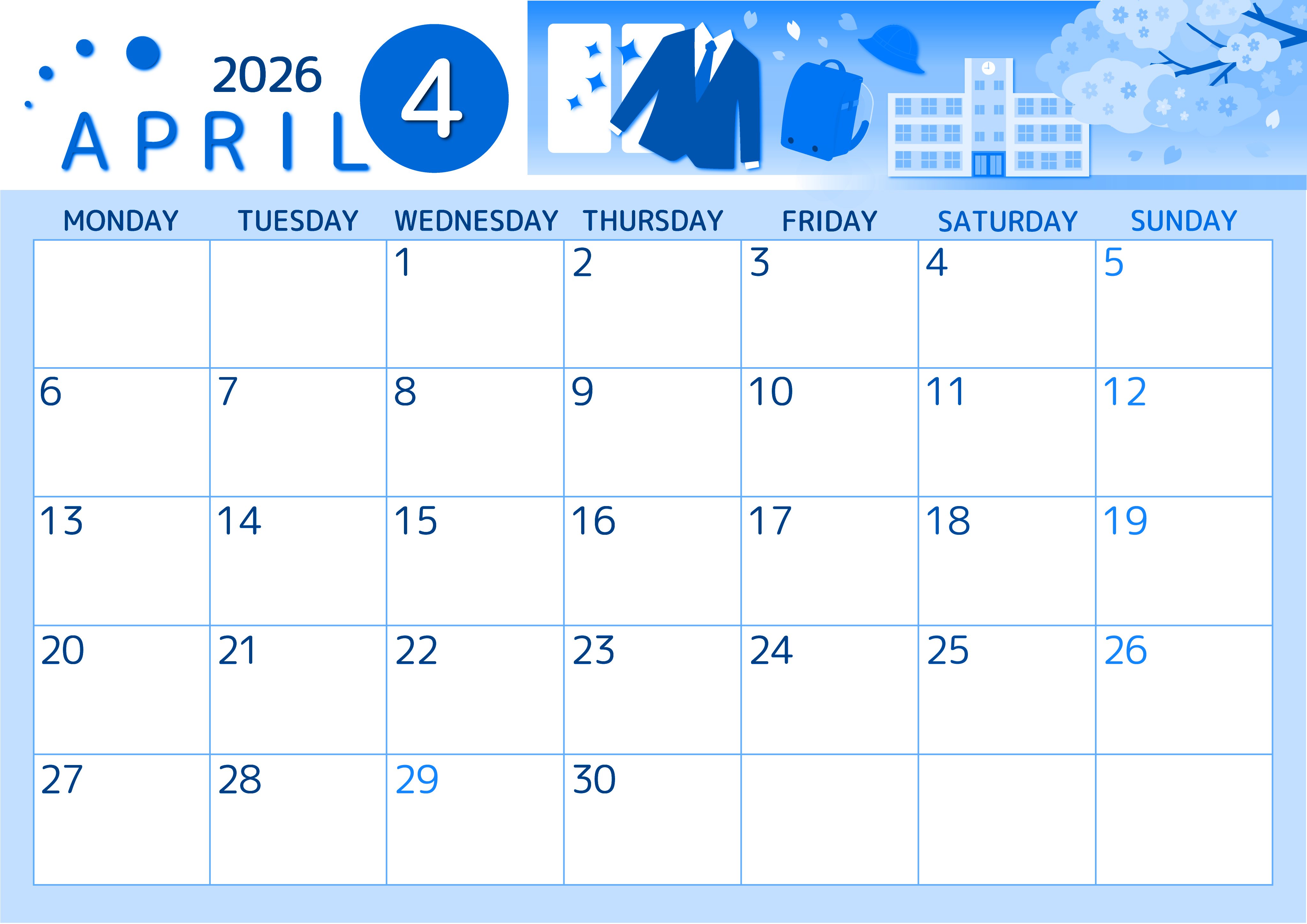 2026年4月横型月曜始まりの無料テンプレートブルーのカレンダーです。月曜始まりのブルーのカレンダーなので子供の新学期の予定を把握するのにぴったりな無料テンプレートです。入学式のイラストもかわいいです。(2026-00870401)
