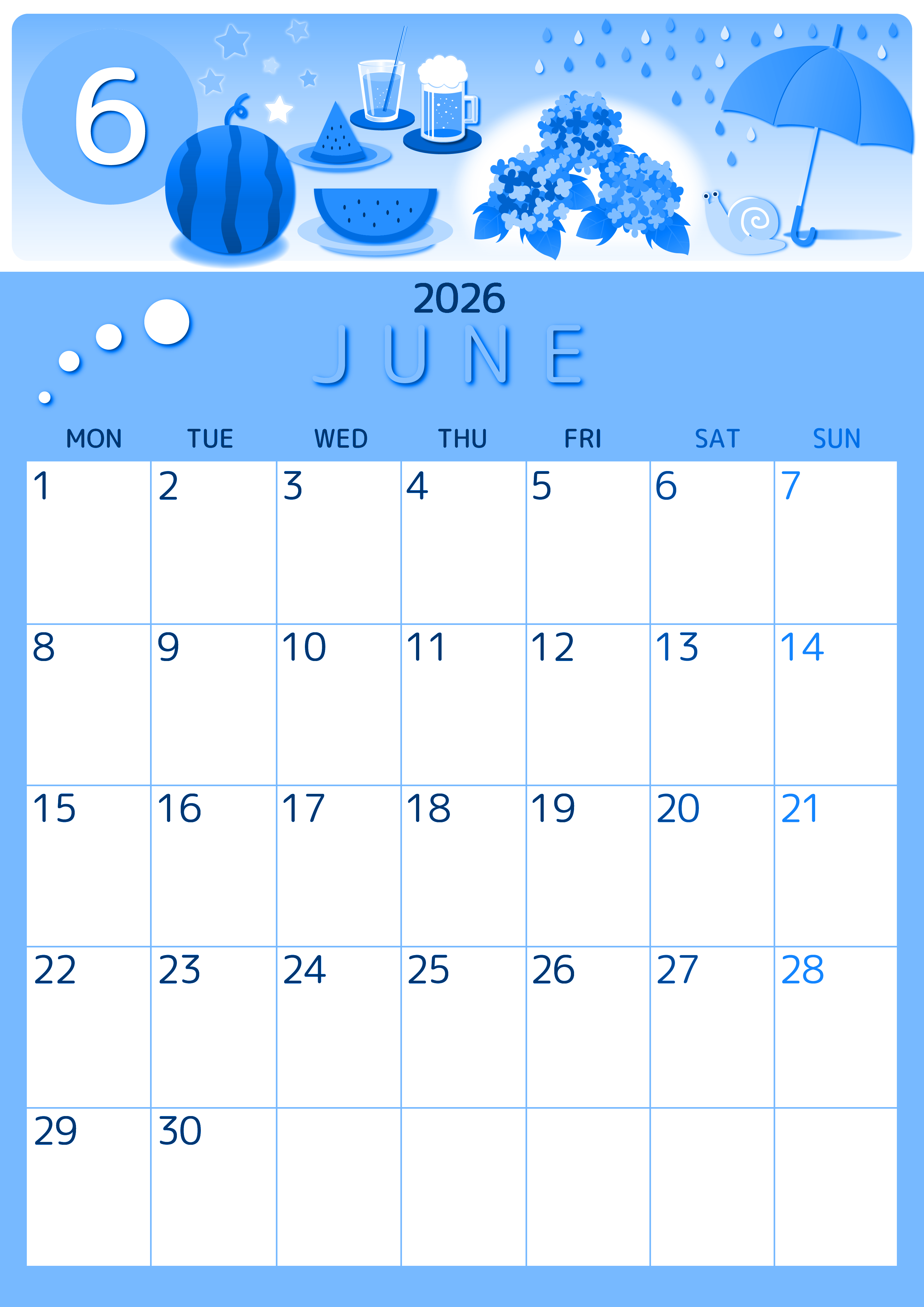 2026年6月縦型月曜始まりの無料テンプレートブルーのカレンダーです。黄色のフレームに囲まれていてスケジュールを記入する欄は白くて使いやすい月曜始まりのブルーのカレンダーです。イラストもすいかがかわいい夏らしい素材です。(2026-00870611)