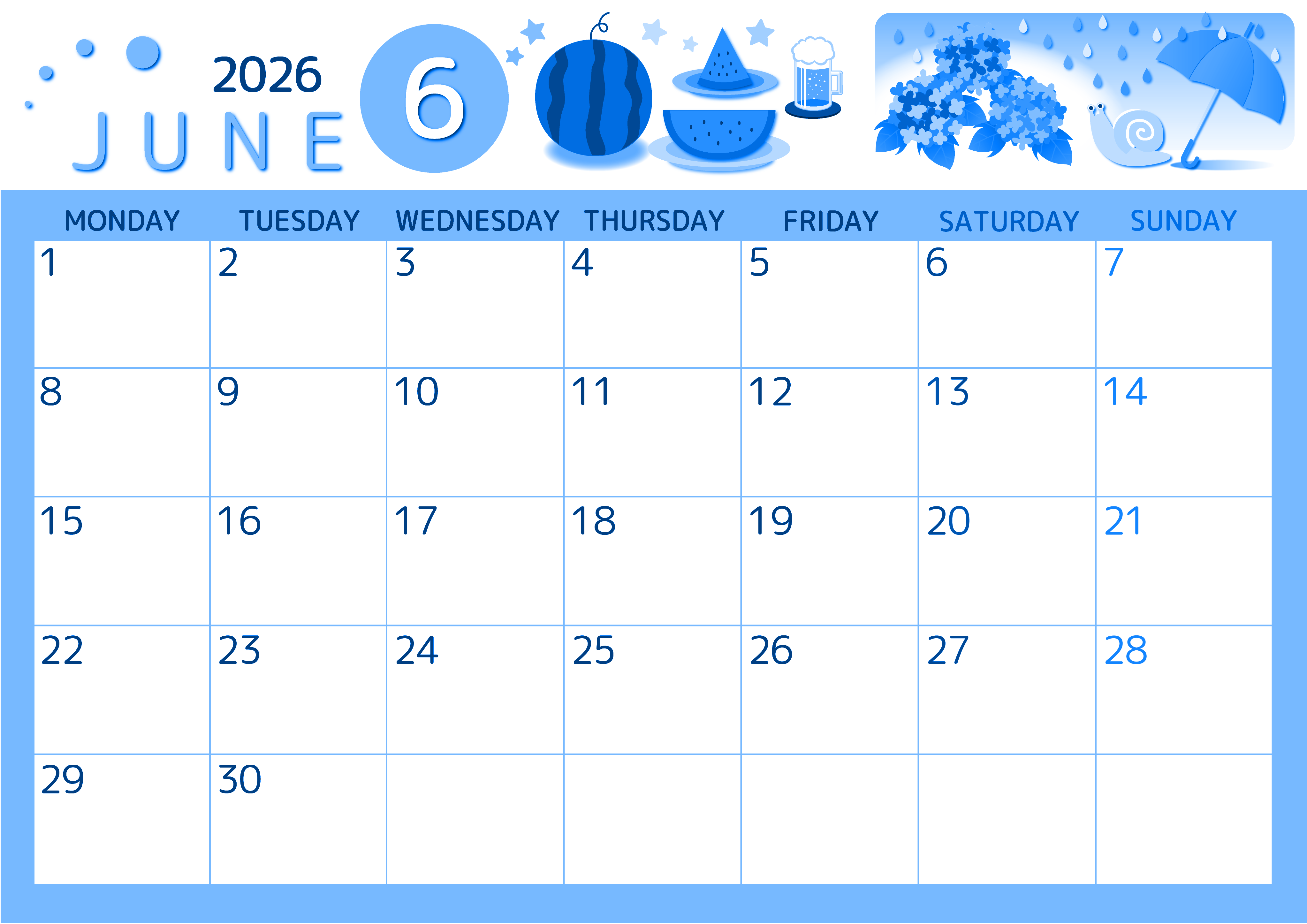 2026年6月横型月曜始まりの無料テンプレートブルーのカレンダーです。月曜始まりでA4サイズのブルーのカレンダーです。すいかと梅雨をモチーフにしたイラストがかわいいのでスケジュールを立てるのが楽しくなります。(2026-00870601)