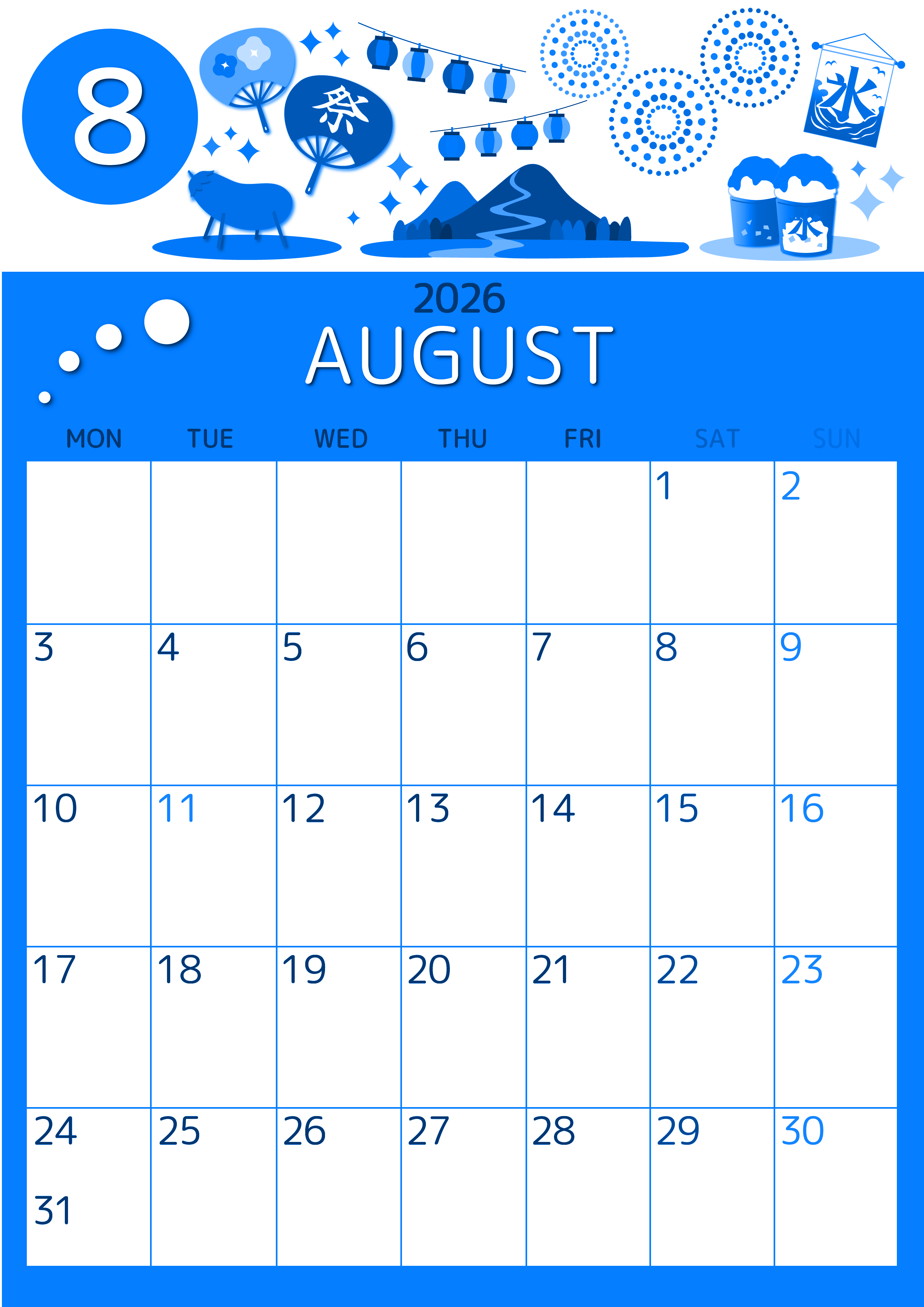2026年8月縦型月曜始まりの無料テンプレートブルーのカレンダーです。月曜始まりであり縦型なので壁に貼るのに丁度良いサイズのブルーのカレンダーです。かわいいイラストも描かれており、夏祭りに行きたくなるようなテイストとなっています。(2026-00870811)