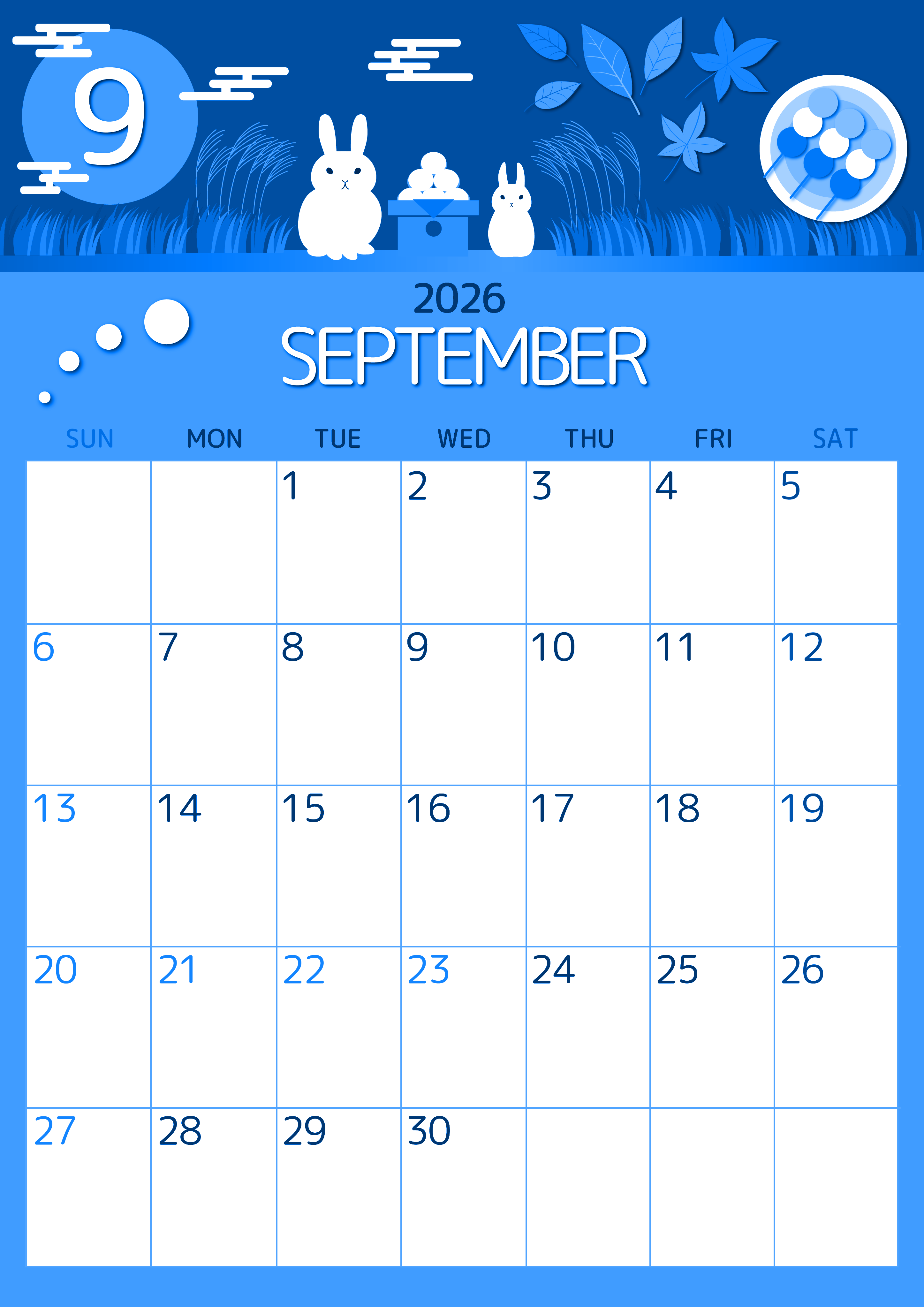 2026年9月縦型日曜始まり 十五夜イラストのかわいいA4無料ブルーのカレンダー(2026-00870910)