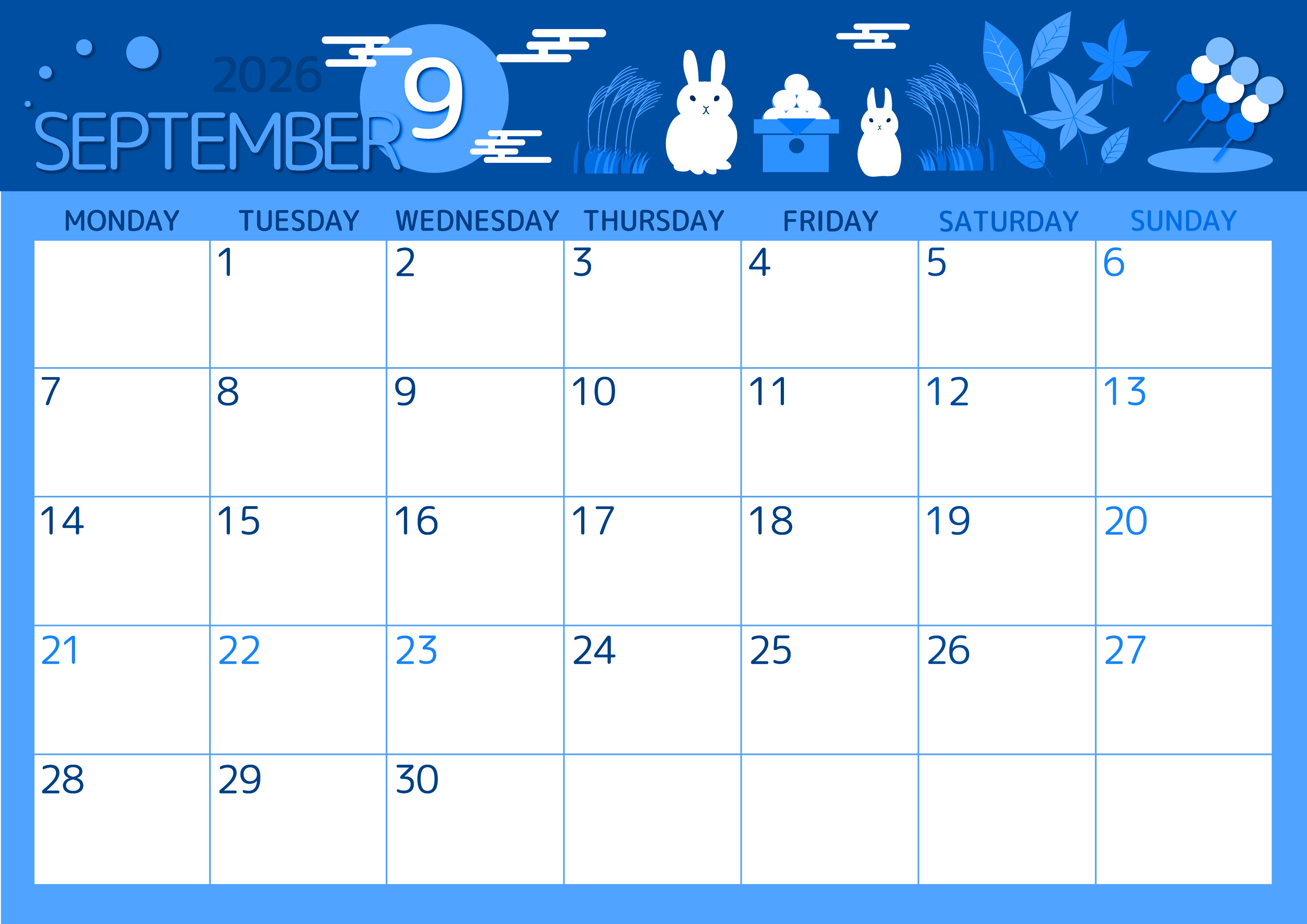 2026年9月横型月曜始まりの無料テンプレートブルーのカレンダーです。十五夜をテーマにしたイラストがふんだんに描かれています。うさぎさんがかわいいです。三色団子や紅葉やススキや満月も目を引くポイントです。(2026-00870901)