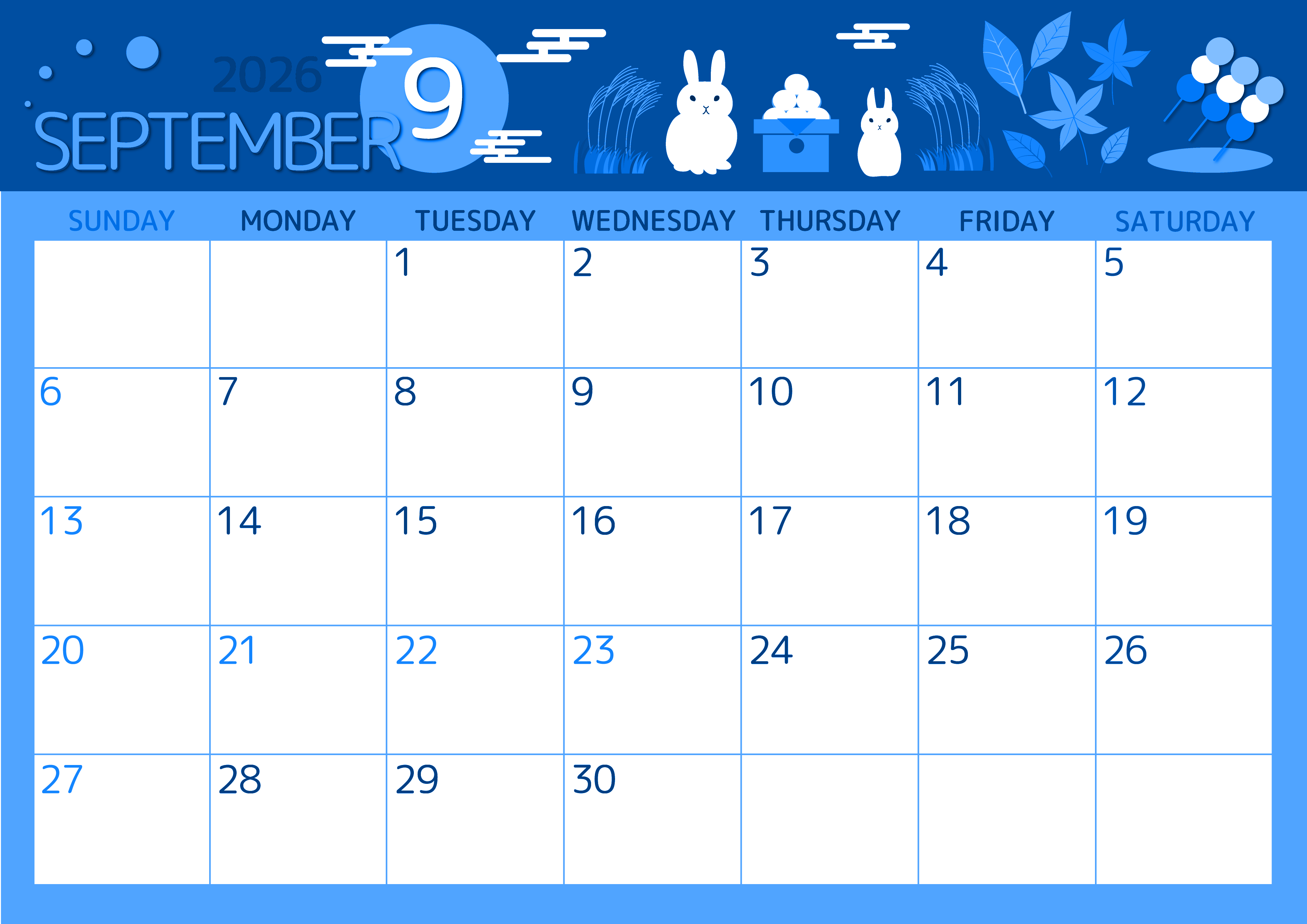 2026年9月横型日曜始まりの無料テンプレートブルーのカレンダーです。十五夜の様子を非常に賑やかに細かく書き上げたかわいいイラストにブルーのカレンダー部分をフレーミングしたとてもかわいいデザインです。(2026-00870900)