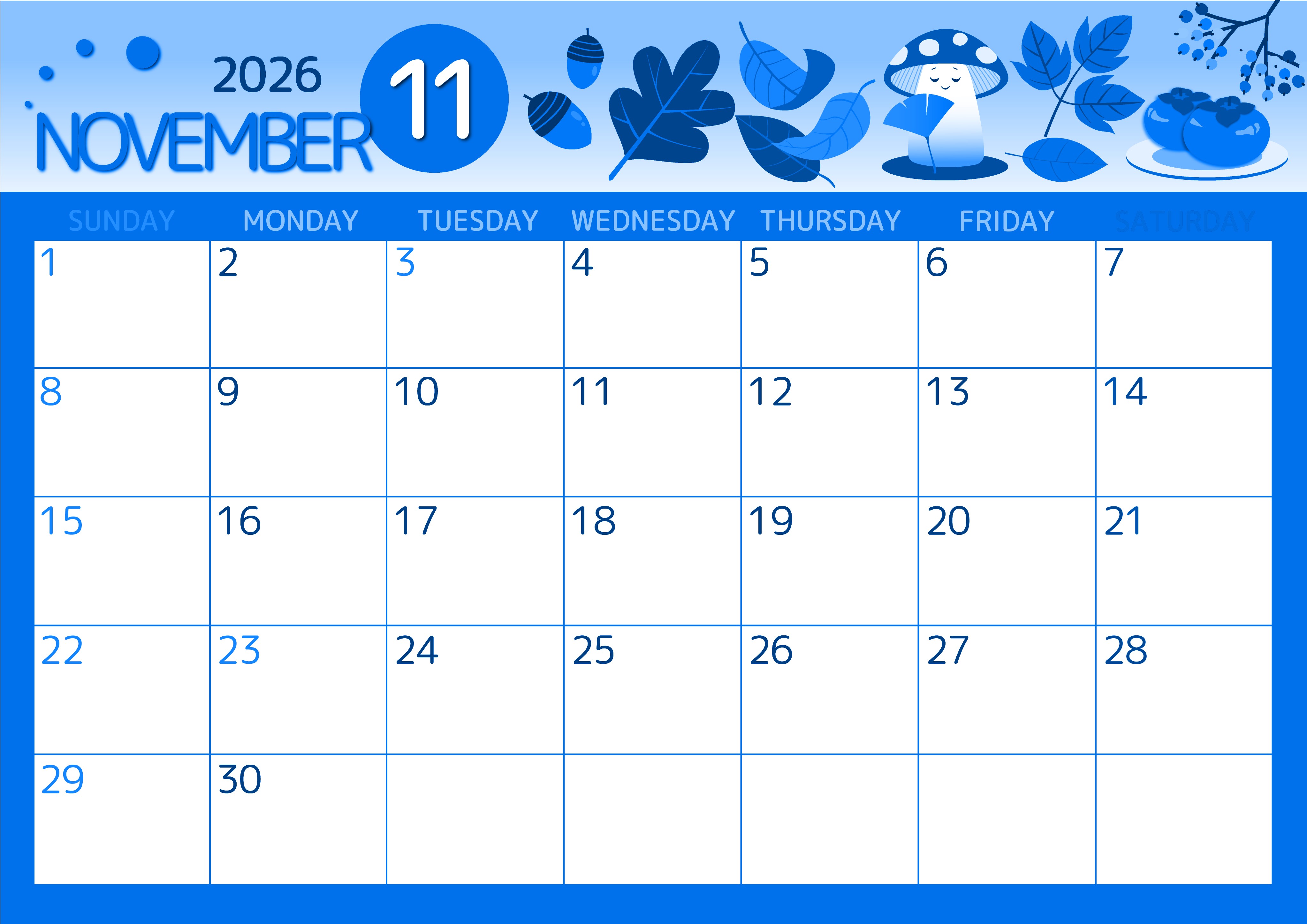 2026年11月横型日曜始まり きのこイラストのかわいいA4無料ブルーのカレンダー(2026-00871100)