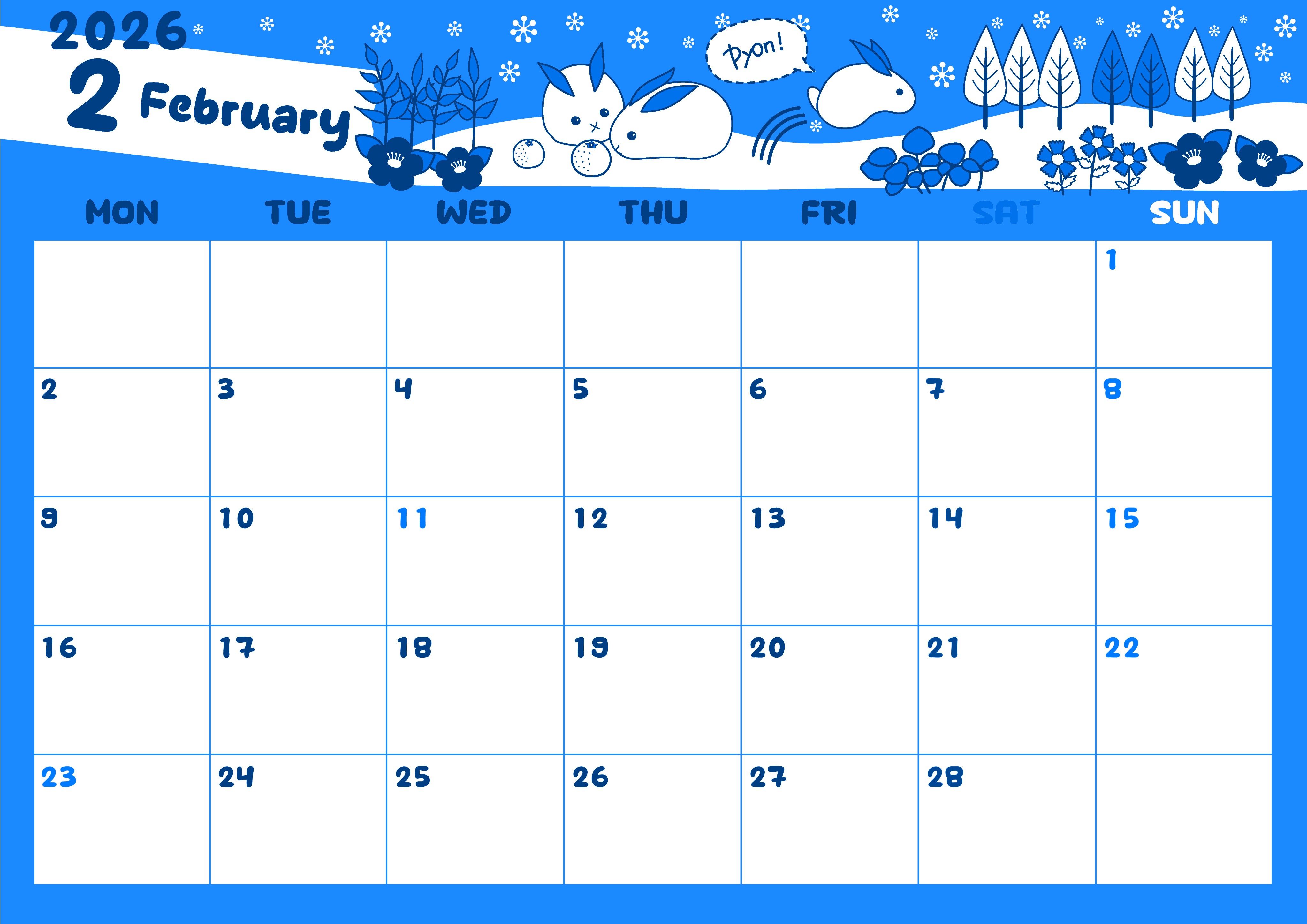 2026年2月横型月曜始まり ポップかわいいイラストA4無料ブルーのカレンダー(2026-00880201)