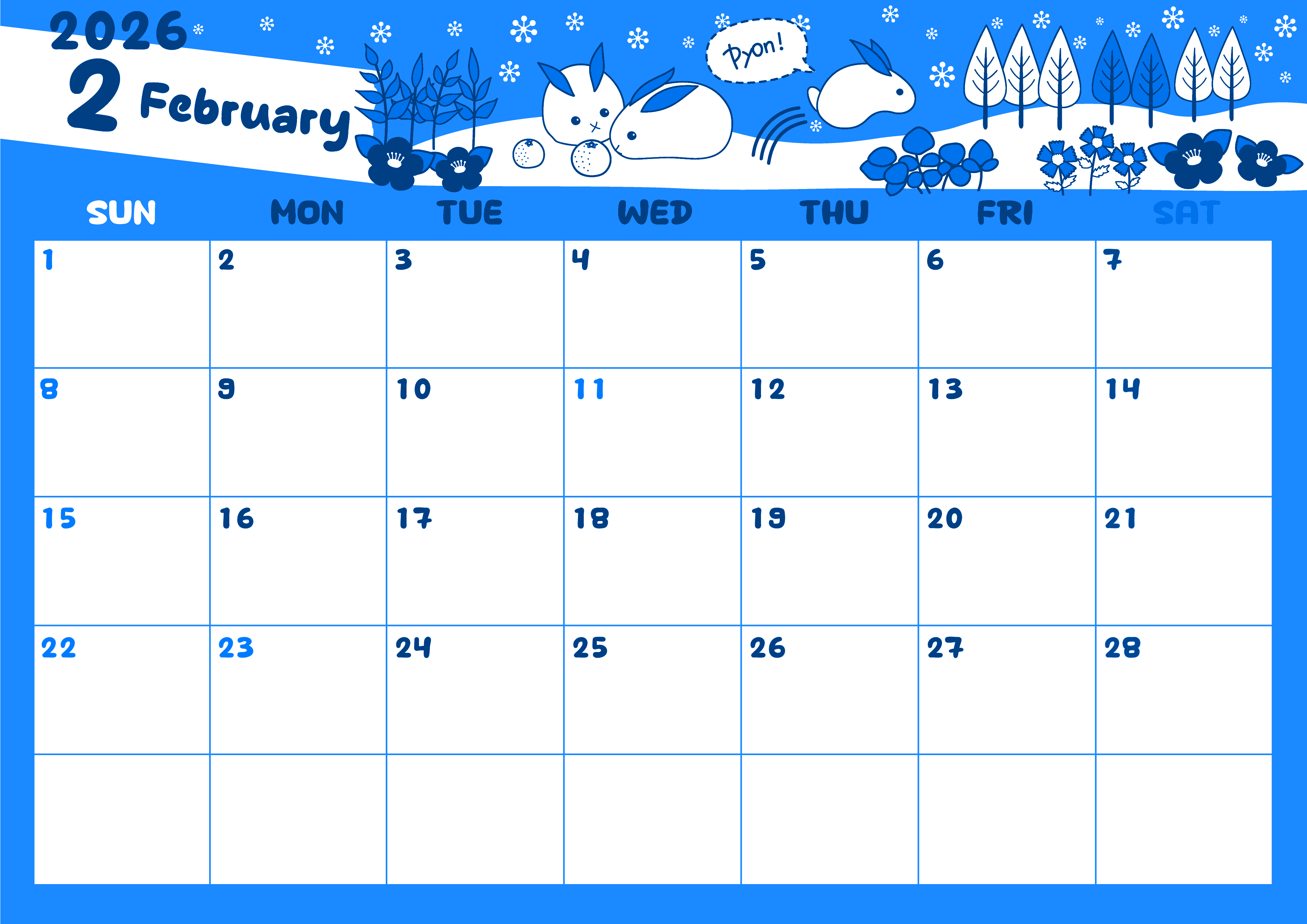 2026年2月横型日曜始まりの無料テンプレートブルーのカレンダーです。ポップで遊び心が詰まったかわいい元気を貰えるようなブルーのカレンダーです。ウサギや森のイラストを眺めているだけでも面白いフリー素材です。(2026-00880200)