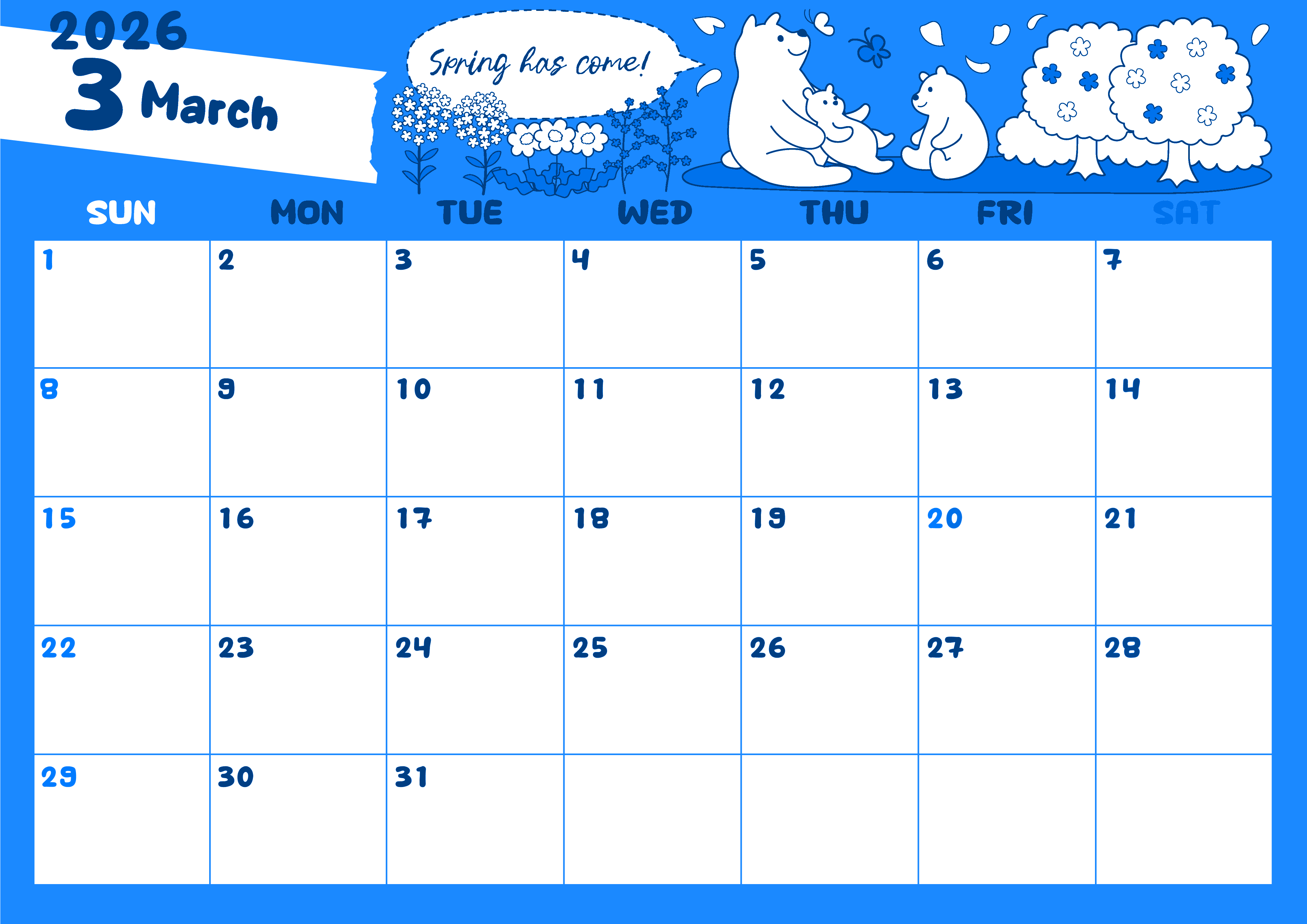 2026年3月横型日曜始まりの無料テンプレートブルーのカレンダーです。白熊の家族が仲良しそうに戯れている様子のイラストがポップでかわいい枠でかこまれたブルーのカレンダーです。罫線がしっかりと引かれているので子供から高齢者まで使いやすいデザインです。(2026-00880300)