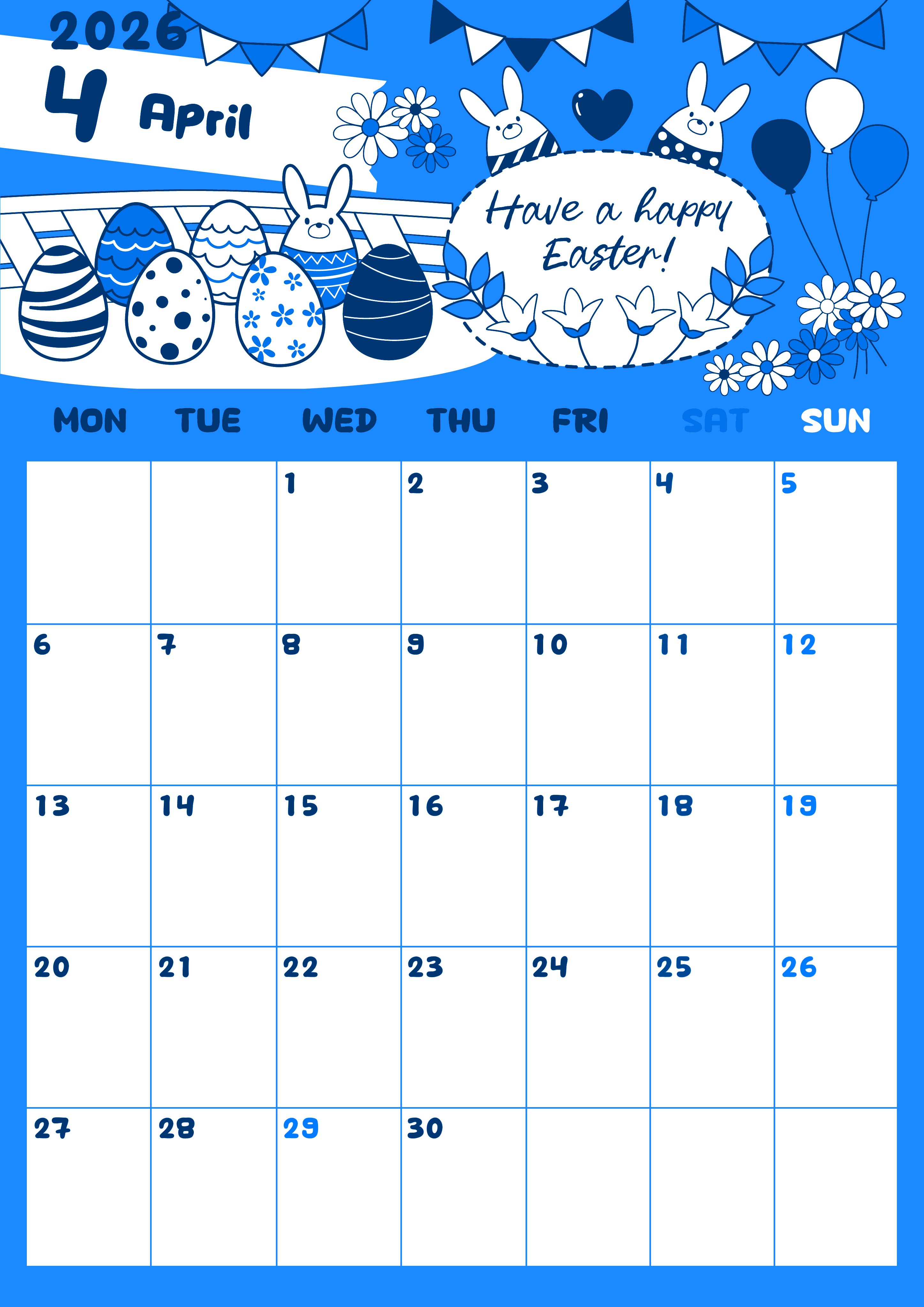 2026年4月縦型月曜始まりの無料テンプレートブルーのカレンダーです。イースターエッグとフラッグといったフェスティバル感が満載のイラストがかわいいブルーのカレンダー素材です。ダウンロードは無料にて行えて便利です。(2026-00880411)