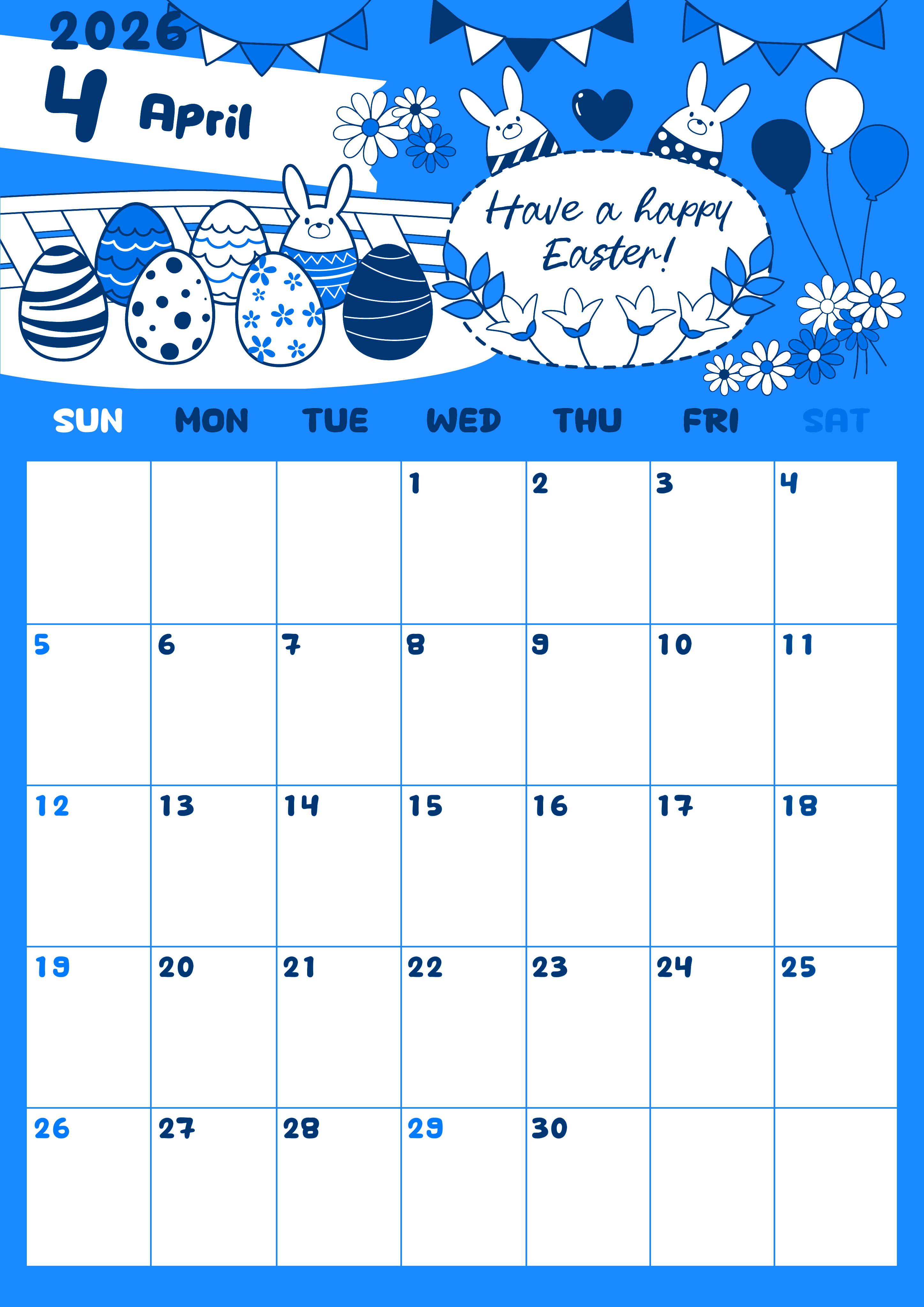 2026年4月縦型日曜始まり イースターエッグイラストのかわいいA4無料ブルーのカレンダー(2026-00880410)