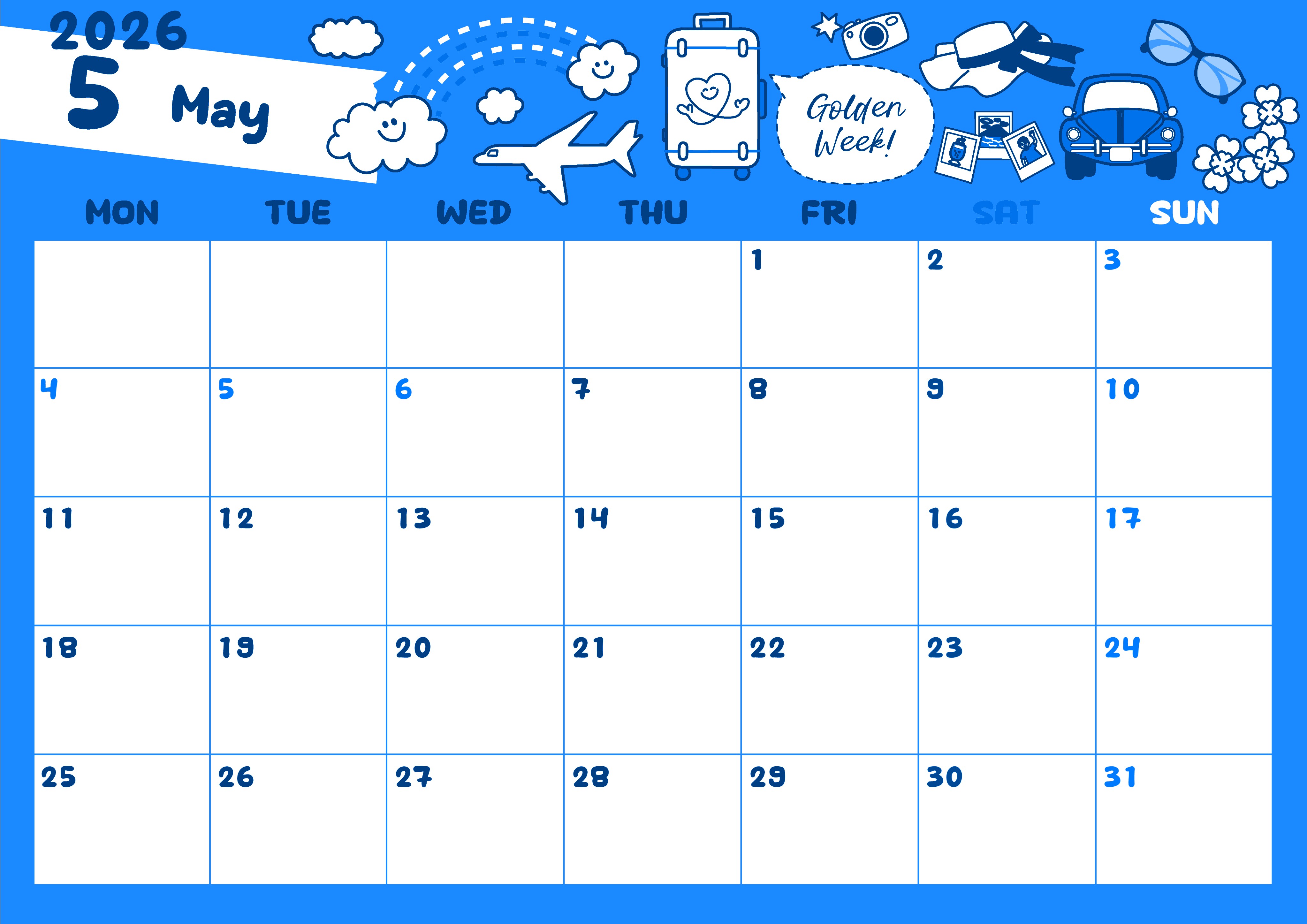2026年5月横型月曜始まりの無料テンプレートブルーのカレンダーです。枠がイエローでGWのワクワク感が伝わってくるようなかわいいイラストです。ブルーのカレンダー部分は月曜始まりかつ曜日の文字が色分けされているので実用性が高いです。(2026-00880501)