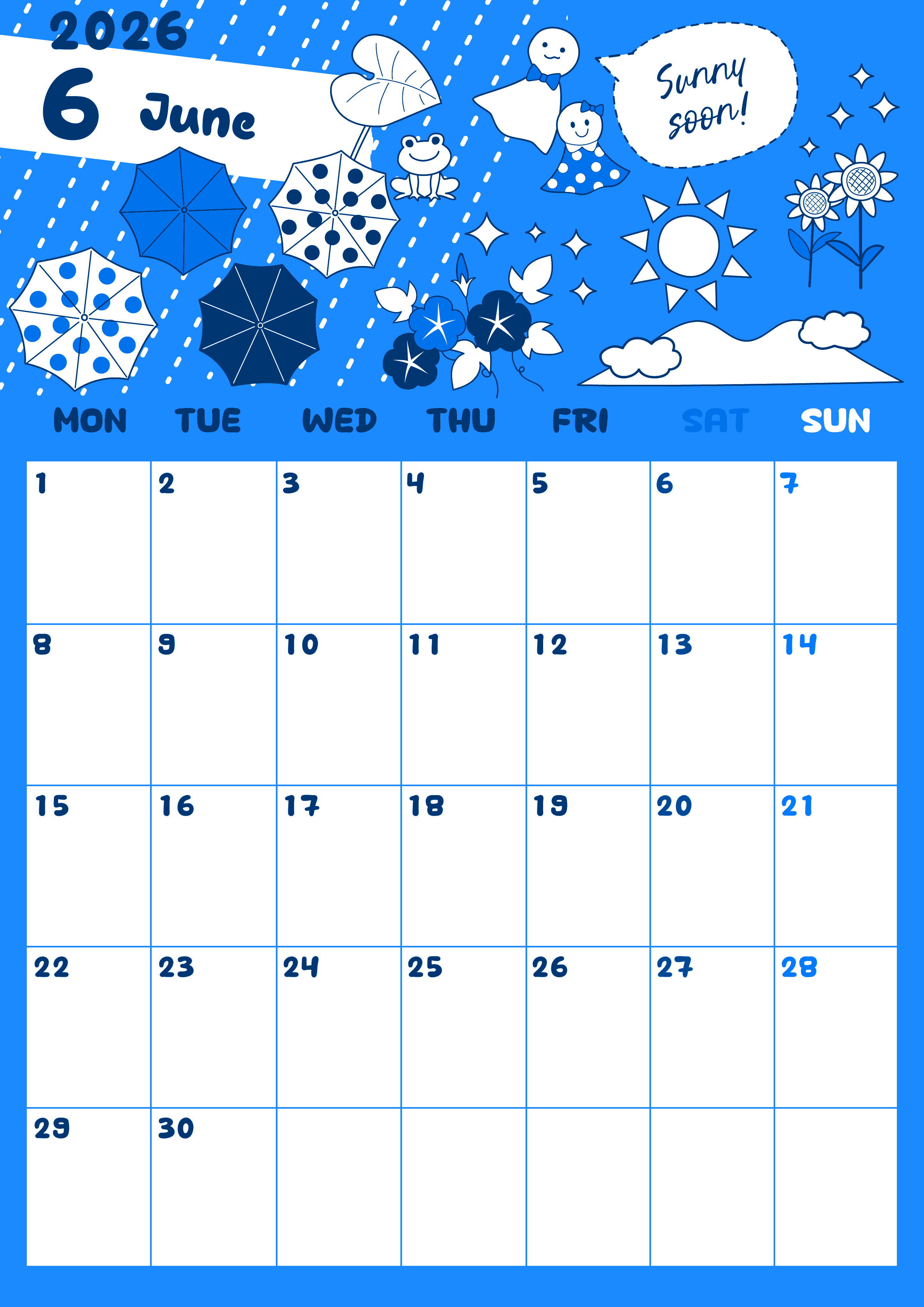 2026年6月縦型月曜始まりの無料テンプレートブルーのカレンダーです。ブルーのカレンダーは月曜始まりがいいという人におすすめの休みと平日の見分けがやりやすいかわいいイラストブルーのカレンダーとなっています。(2026-00880611)
