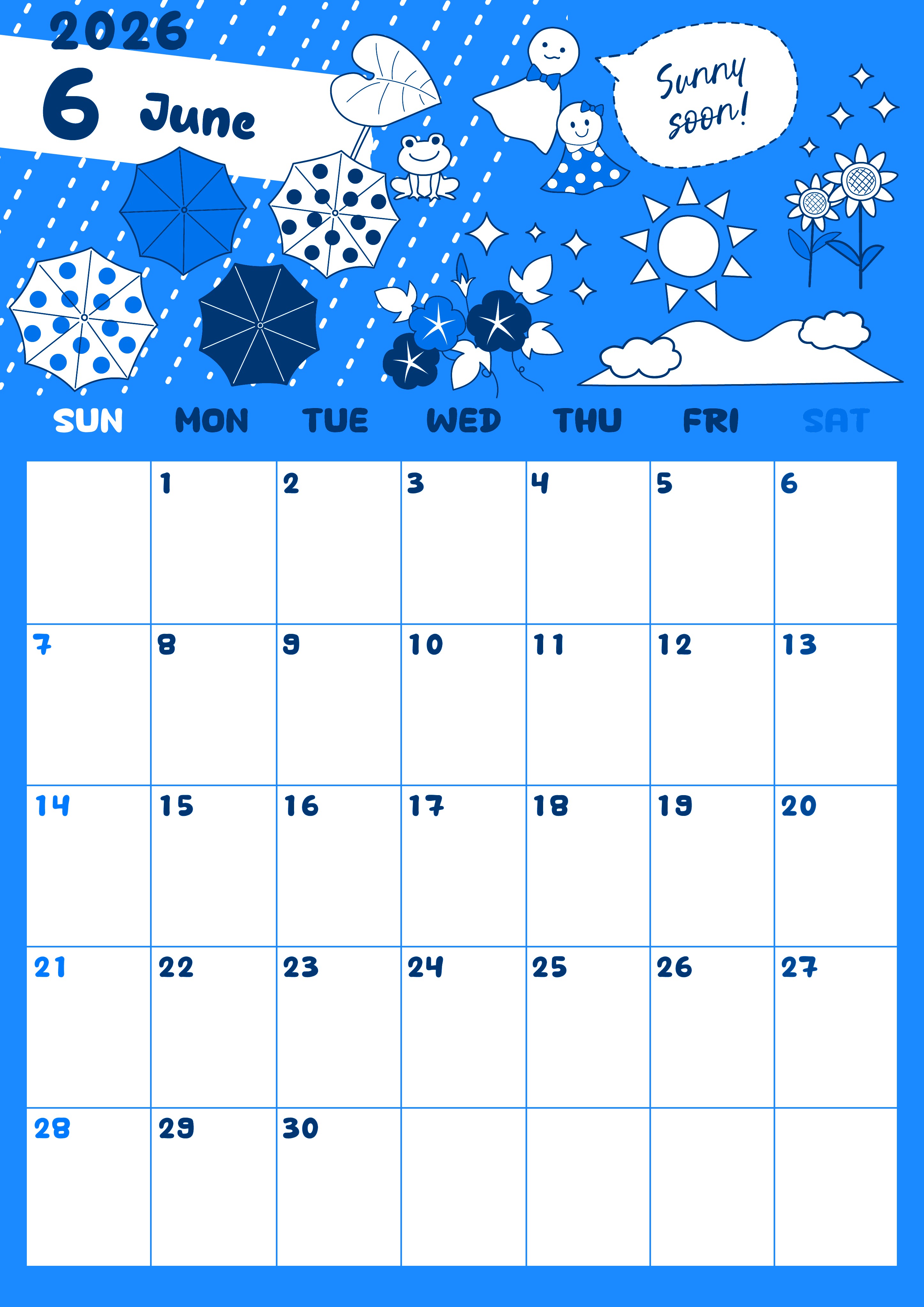2026年6月縦型日曜始まりの無料テンプレートブルーのカレンダーです。オリジナルイラストが季節物をテーマにしていてポップかわいいユーモアさもあるブルーのカレンダーです。字が大きいので便利で見やすいです。(2026-00880610)