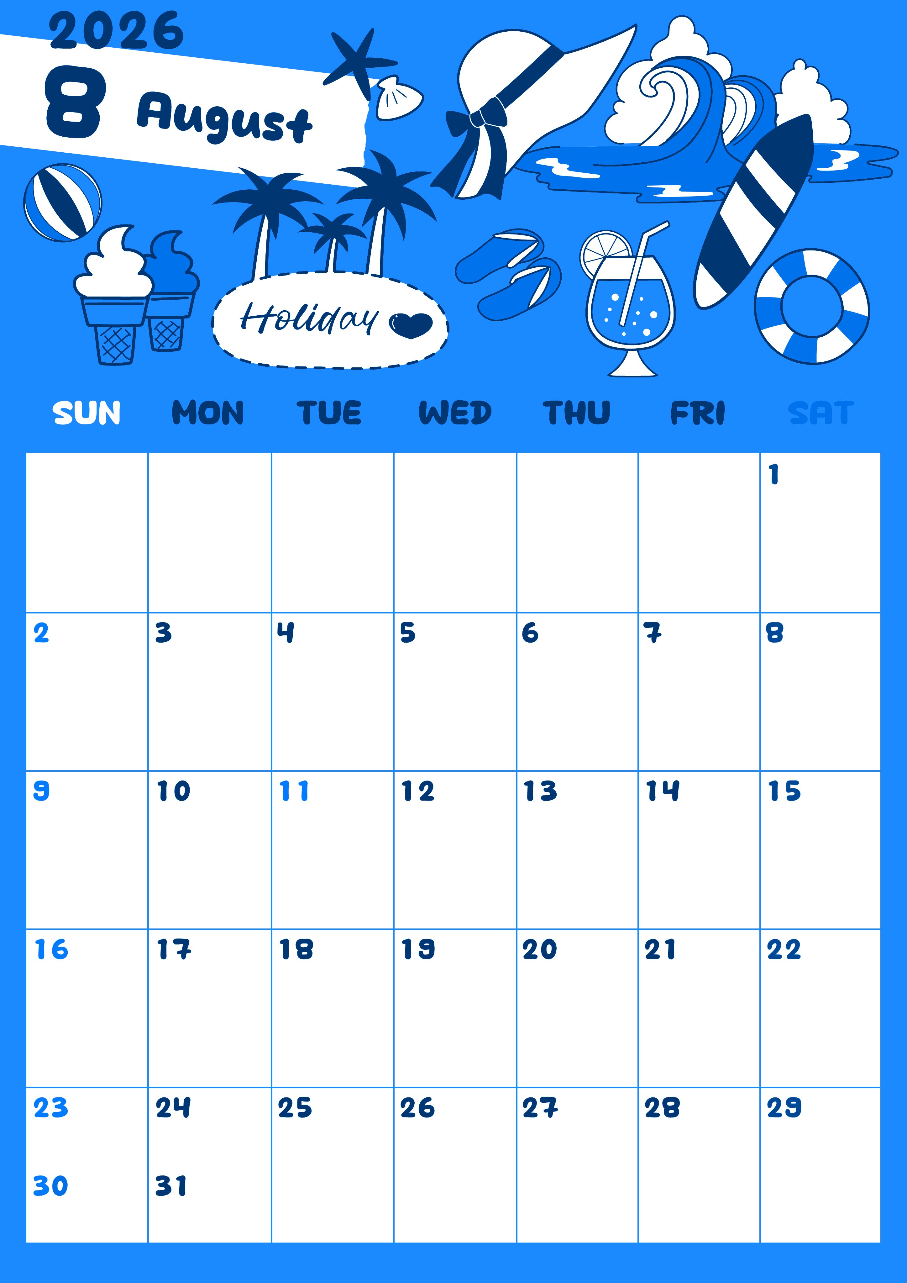2026年・無料のカレンダーテンプレート 2026年8月縦型日曜始まり 海岸イラストのかわいいA4無料ブルーのカレンダー(2026-00880810) 素材状デザイン王 2025年4月4日 2026年8月縦型日曜始まりの無料テンプレートブルーのカレンダーです。夏休みの海岸のバケーション感を表現したイラストがポップでかわいいブルーのカレンダーです。元気が出そうです。(2026-00880810) 8月 縦型のカレンダー 日曜始まり ブルー カレンダーデザイン-0088
