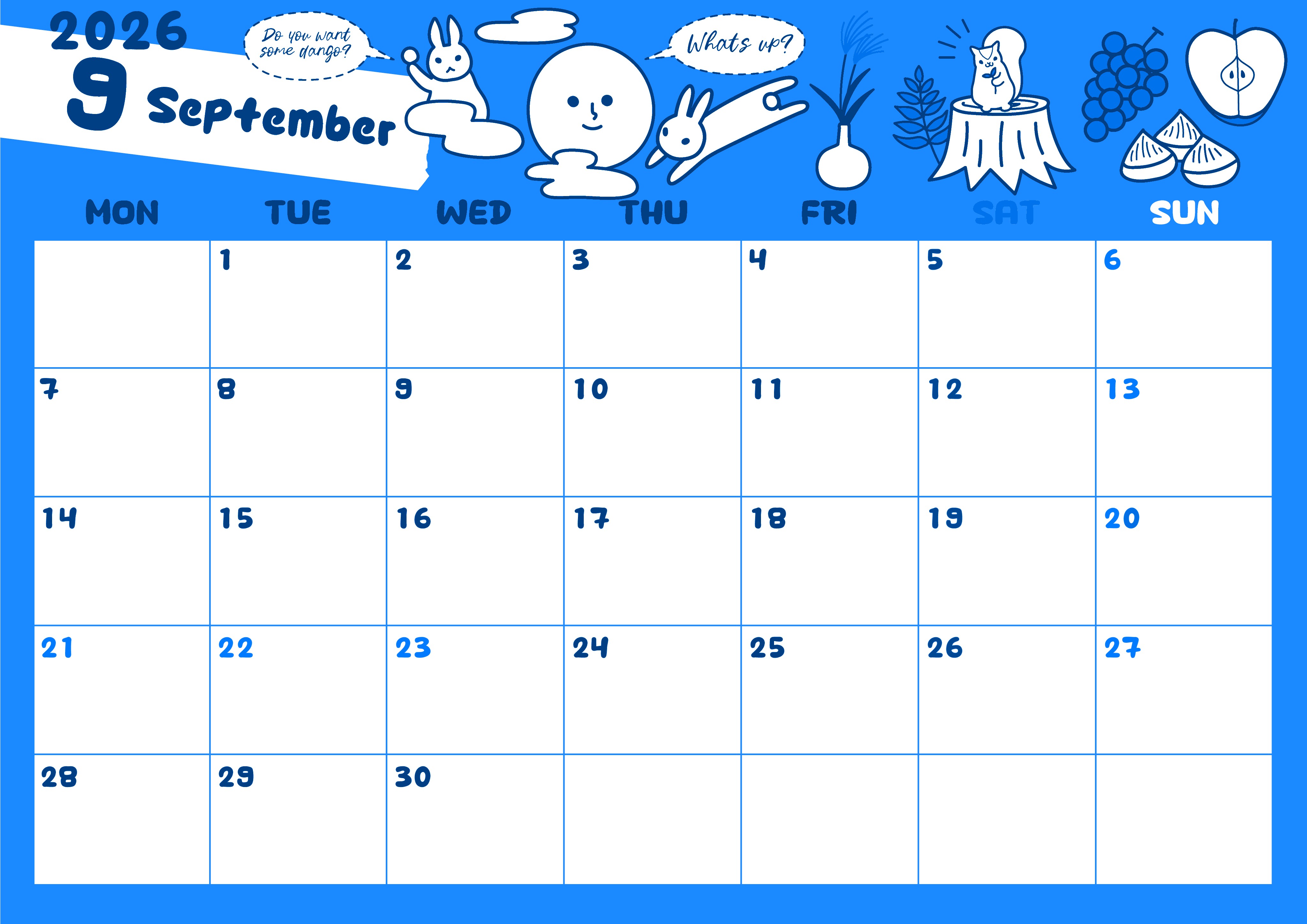 2026年9月横型月曜始まりの無料テンプレートブルーのカレンダーです。枠が特徴的でポップです。森の動物をポップなタッチで一匹ずつ丁寧に描いたかわいい細部まで技巧が行き届いたイラストブルーのカレンダーとなっています。(2026-00880901)