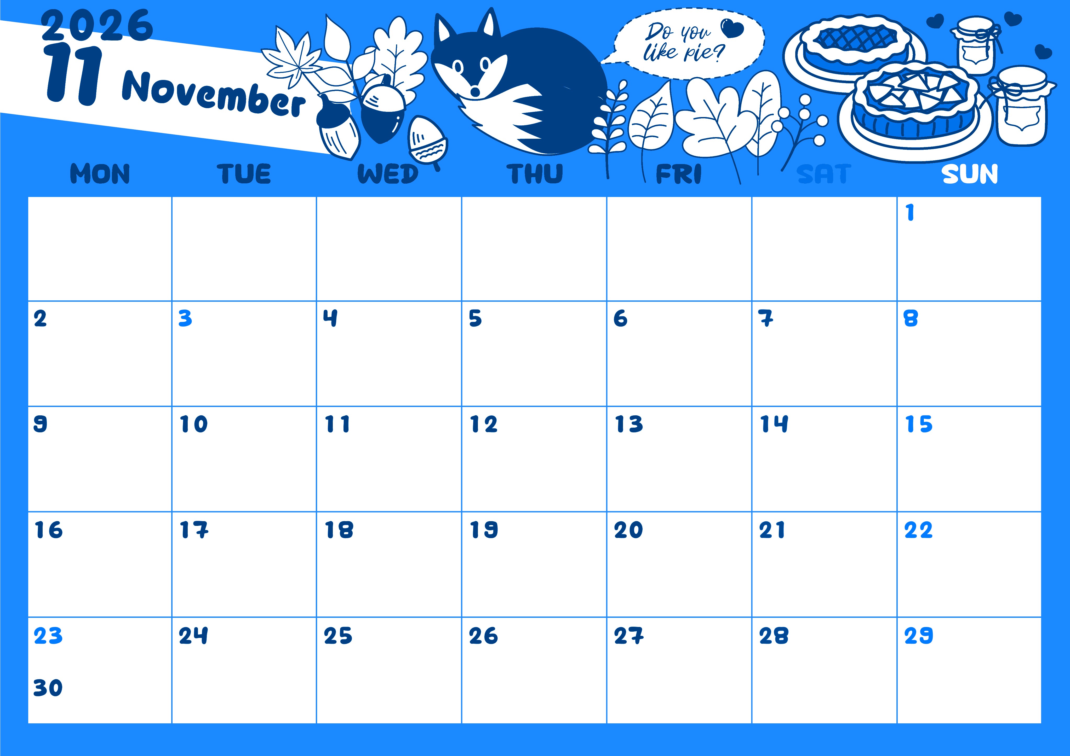 2026年11月横型月曜始まりの無料テンプレートブルーのカレンダーです。食欲の秋に食べたくなるようなアップルパイのイラストが右上に施されていて全体的に使っているので金運にも良いデザインとなっています。(2026-00881101)