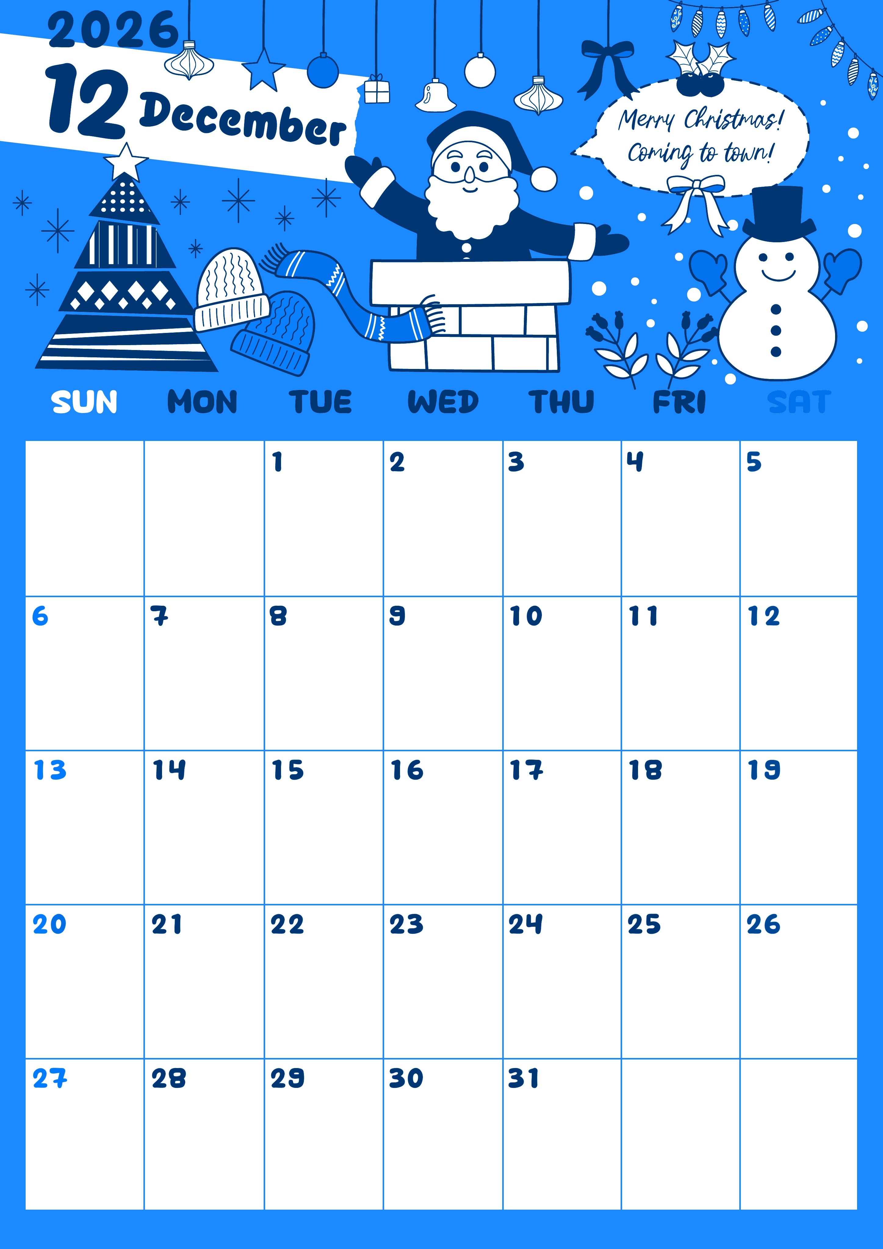 2026年12月縦型日曜始まりの無料テンプレートブルーのカレンダーです。黄色の背景にサンタのイラストが描かれているかわいいポップな世界観の実用性が高いフリー素材です。ダウンロードは無料で行えるので便利です。(2026-00881210)