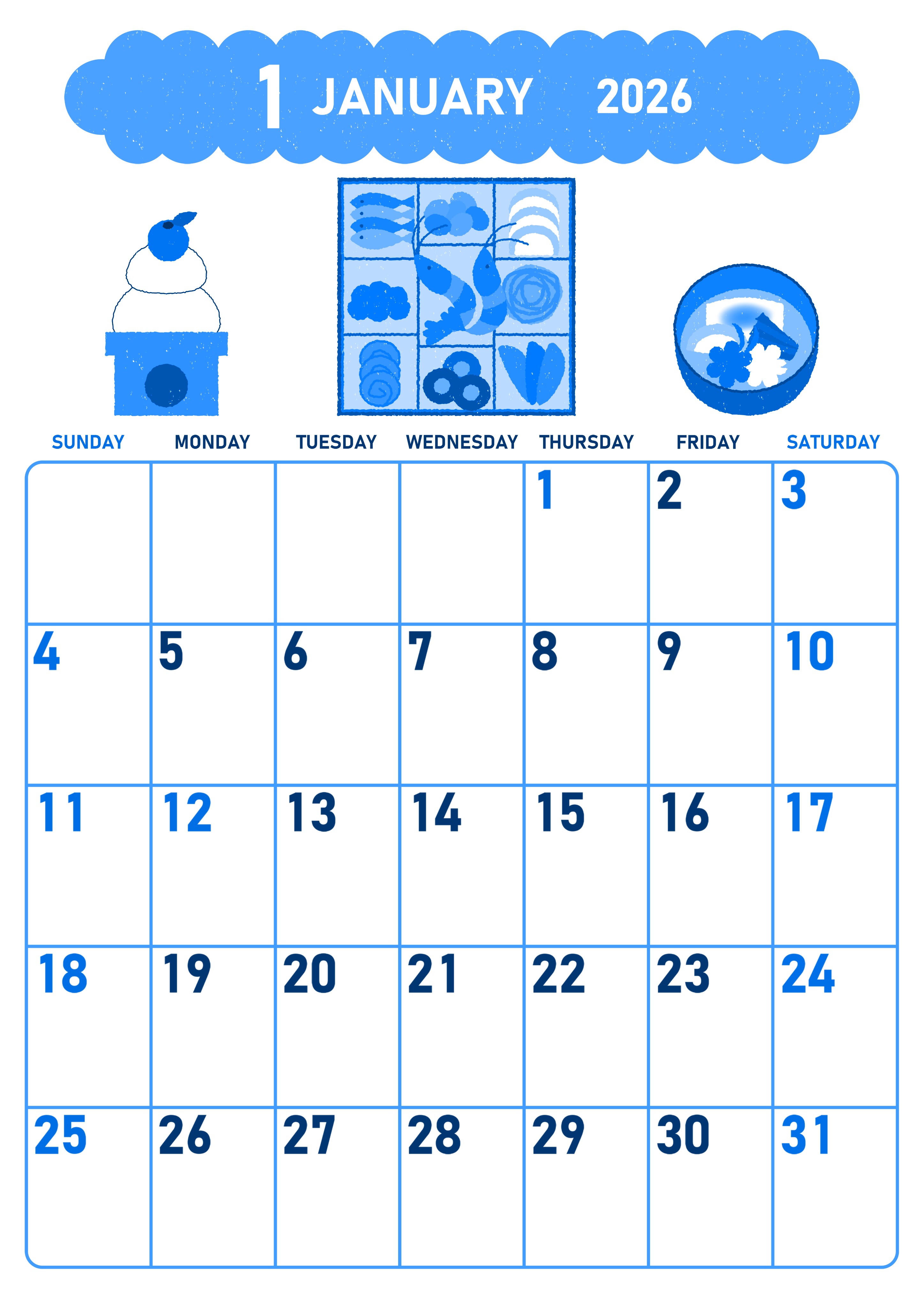 2026年1月縦型日曜始まりブルーのカレンダーです。1月January2026年を乗せた雲が左上に配置されていてブルーのカレンダーとして見やすいフォーマットとなっています。お節や鏡餅やお雑煮のイラストだけでなく曜日が色分けされているのもおすすめポイントな無料ブルーのカレンダーです。(2026-00890110)