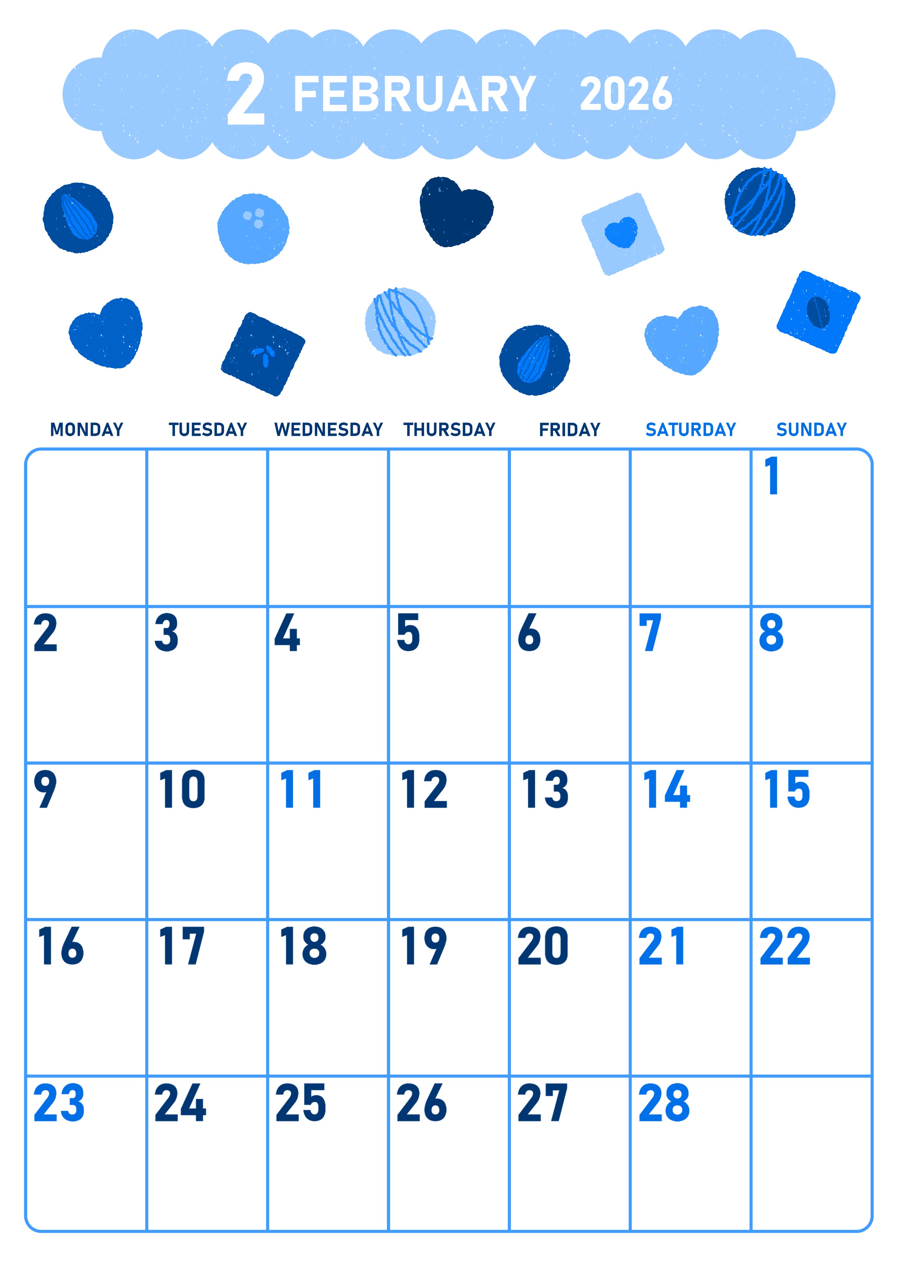 2026年・無料のカレンダーテンプレート 2026年2月縦型月曜始まり チョコのイラストがかわいいA4無料ブルーのカレンダー(2026-00890211) 素材状デザイン王 2025年4月4日 2026年2月縦型月曜始まりブルーのカレンダーです。チョコレートがかわいいイラスト付きのフォーマットです。月曜始まりのブルーのカレンダーで書き込みできるエリアは広くとってあるので使いやすいです。(2026-00890211) 2月 縦型のカレンダー 月曜始まり ブルー カレンダーデザイン-0089