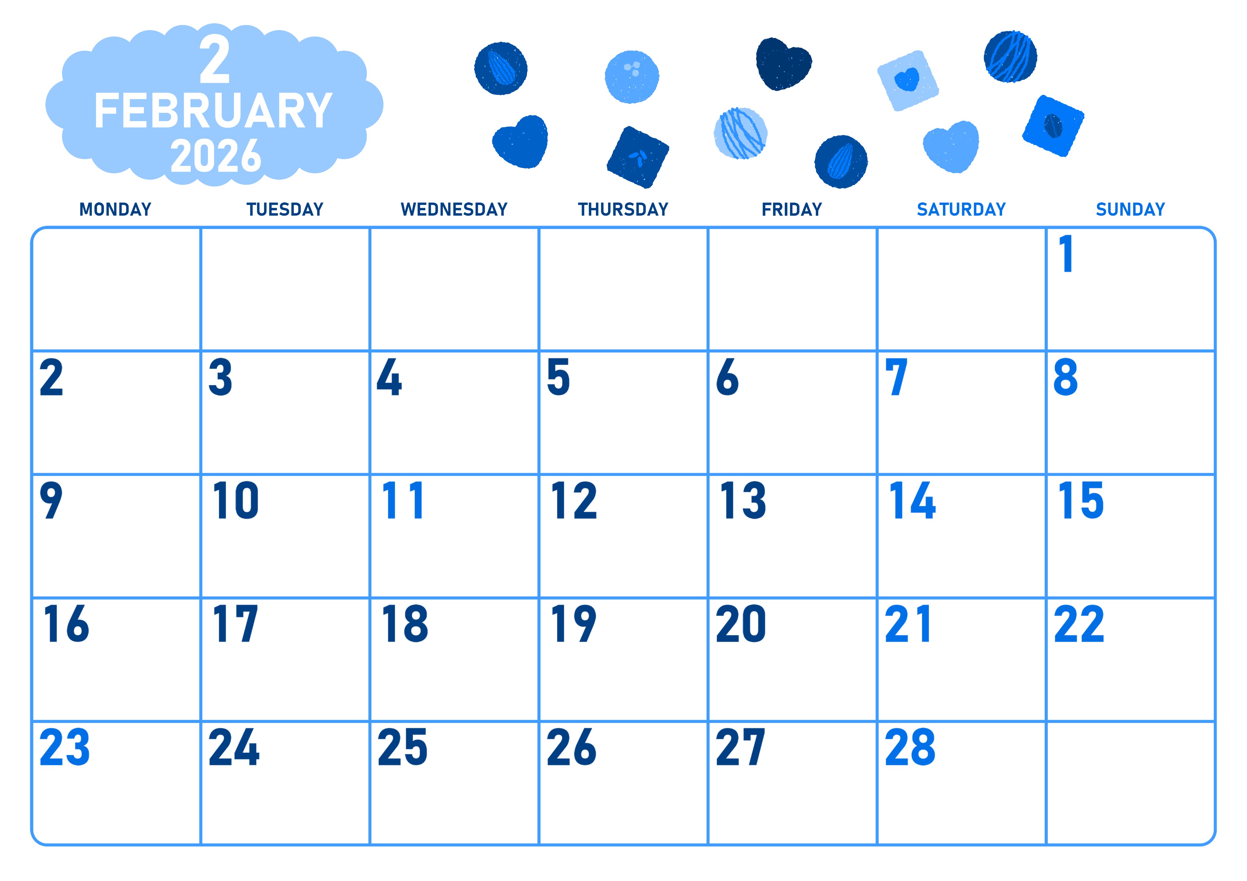 2026年2月横型月曜始まりブルーのカレンダーです。ハートや丸や四角と形のバラエティに富んだチョコレートたちがかわいいイラスト付きの月曜始まりで便利なフォーマットのブルーのカレンダーです。(2026-00890201)