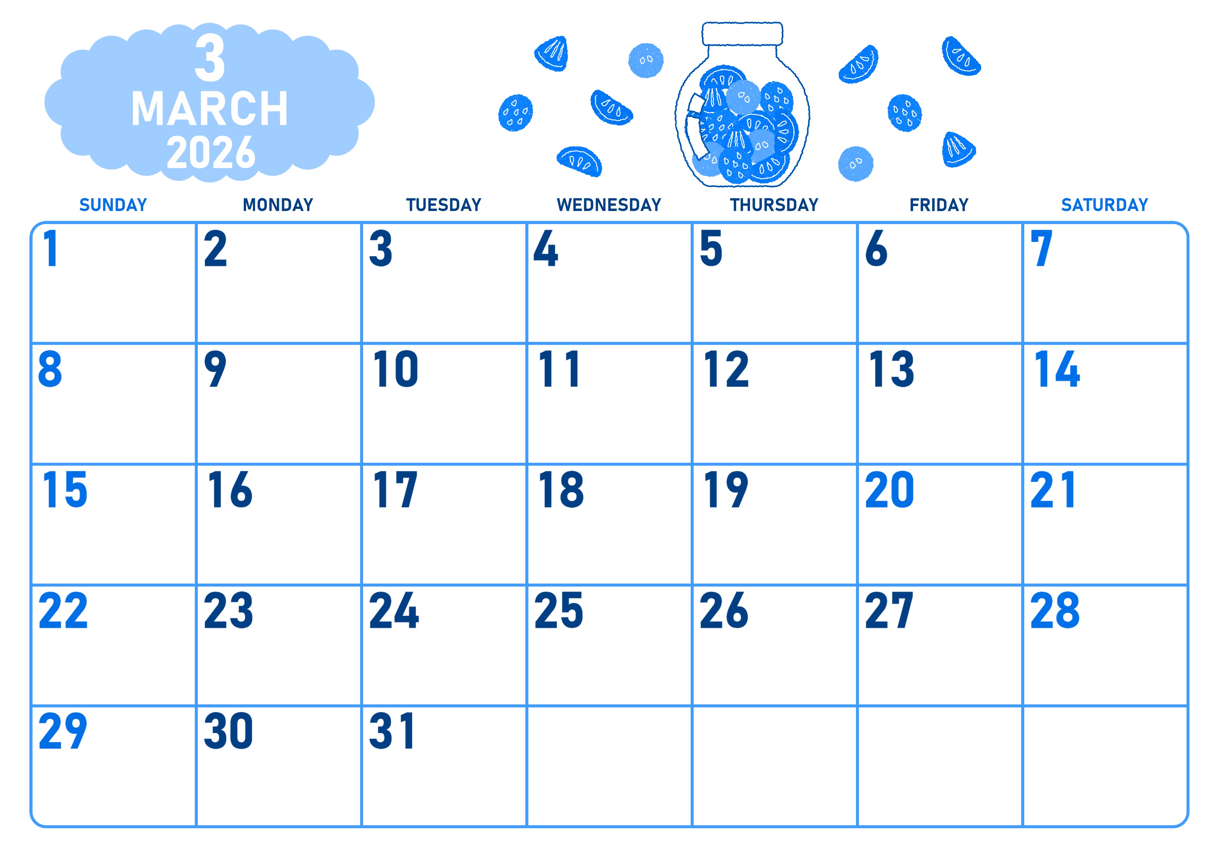 2026年3月横型日曜始まりの無料テンプレートブルーのカレンダーです。果物のキャンディがガラスでできたポットに詰まったかわいいイラストのブルーのカレンダーです。食欲をそそられて使うのも楽しくなります。(2026-00890300)