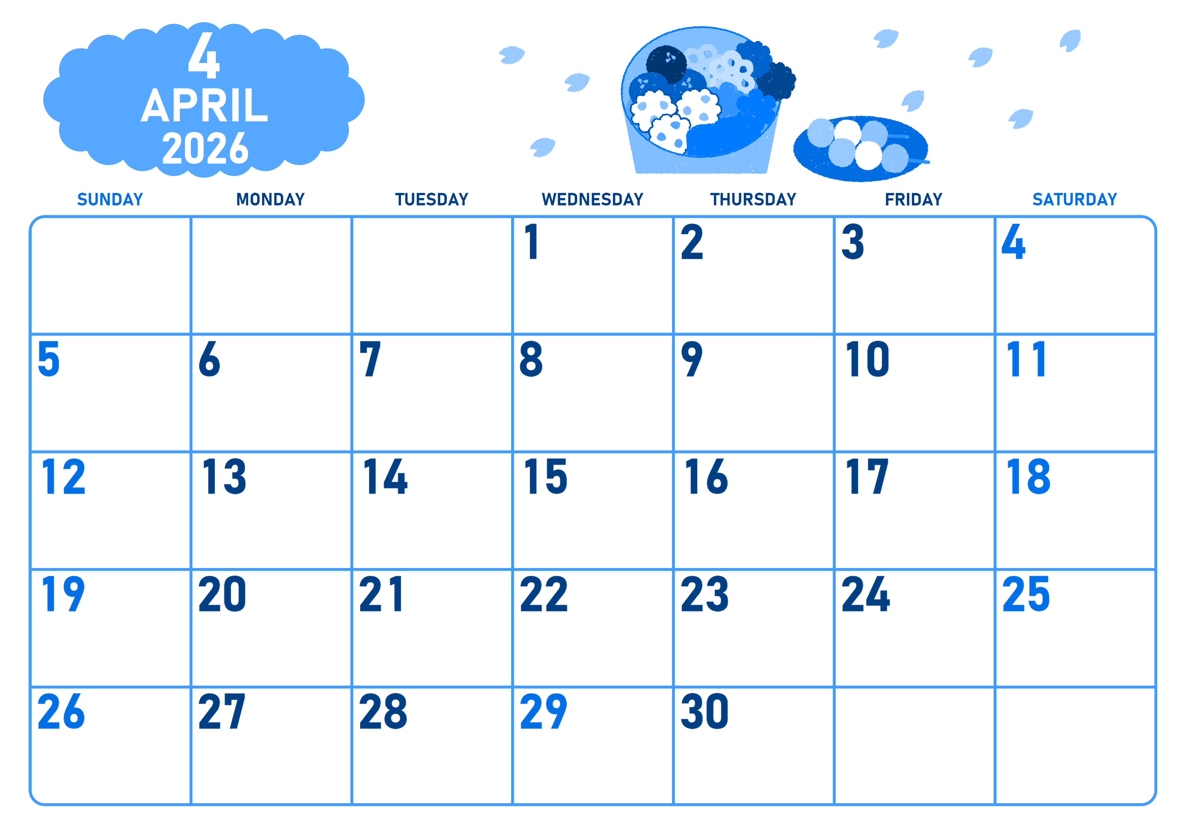 2026年・無料のカレンダーテンプレート 2026年4月横型日曜始まり お花見イラストのかわいいA4無料ブルーのカレンダー(2026-00890400) 素材状デザイン王 2025年4月4日 2026年4月横型日曜始まりの無料テンプレートブルーのカレンダーです。お花見で食べたいお団子やいろいろな食材が目白押しのかわいいイラストがチャームポイントな無料ブルーのカレンダーとなっています。(2026-00890400) 4月 横型のカレンダー 日曜始まり ブルー カレンダーデザイン-0089