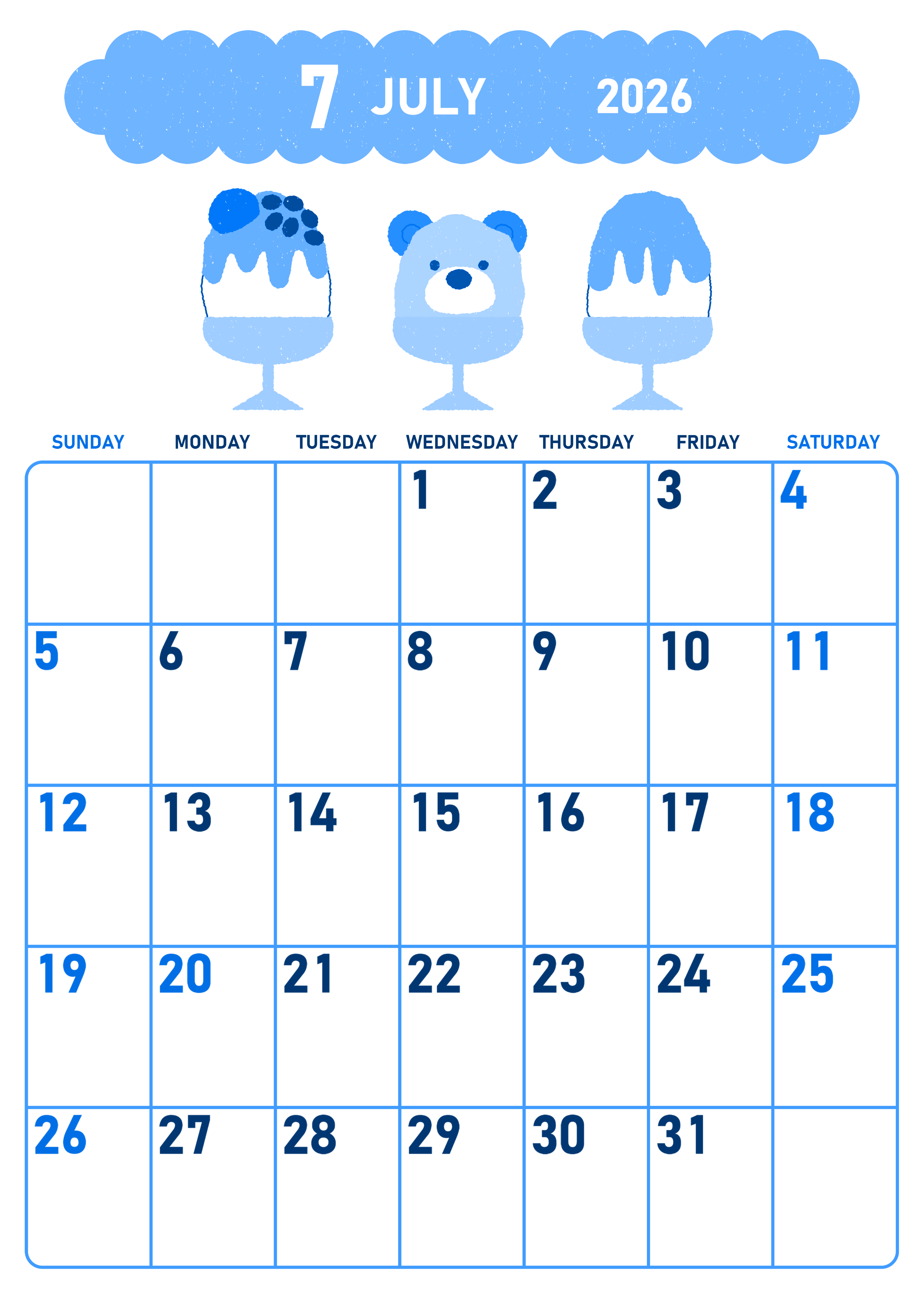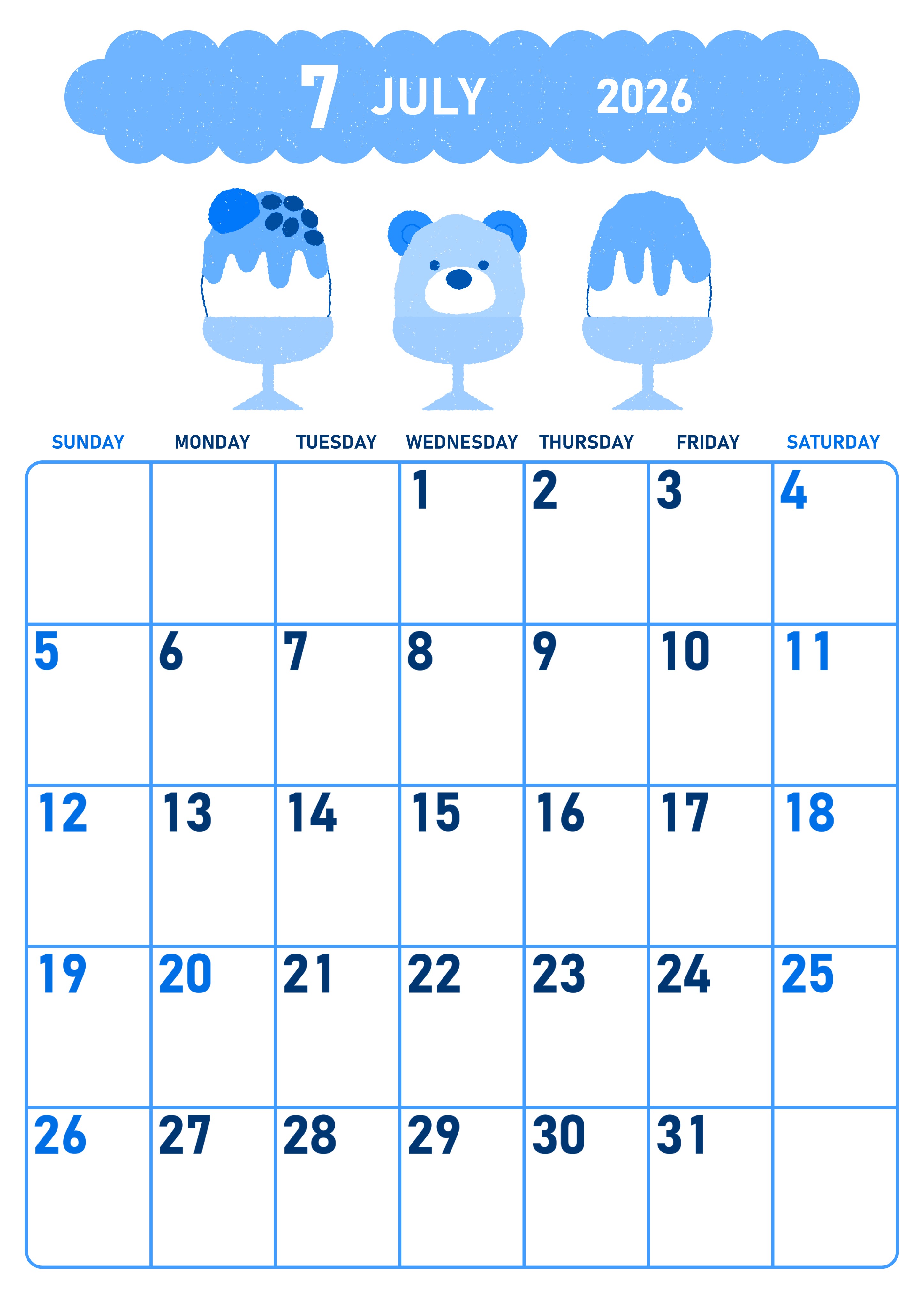 2026年7月縦型日曜始まりの無料テンプレートブルーのカレンダーです。かわいい飽きないようなデザインのイラスト付きブルーのカレンダーを探している人に向いているフリー素材です。かき氷が食べたくなるようなコンテンツです。(2026-00890710)