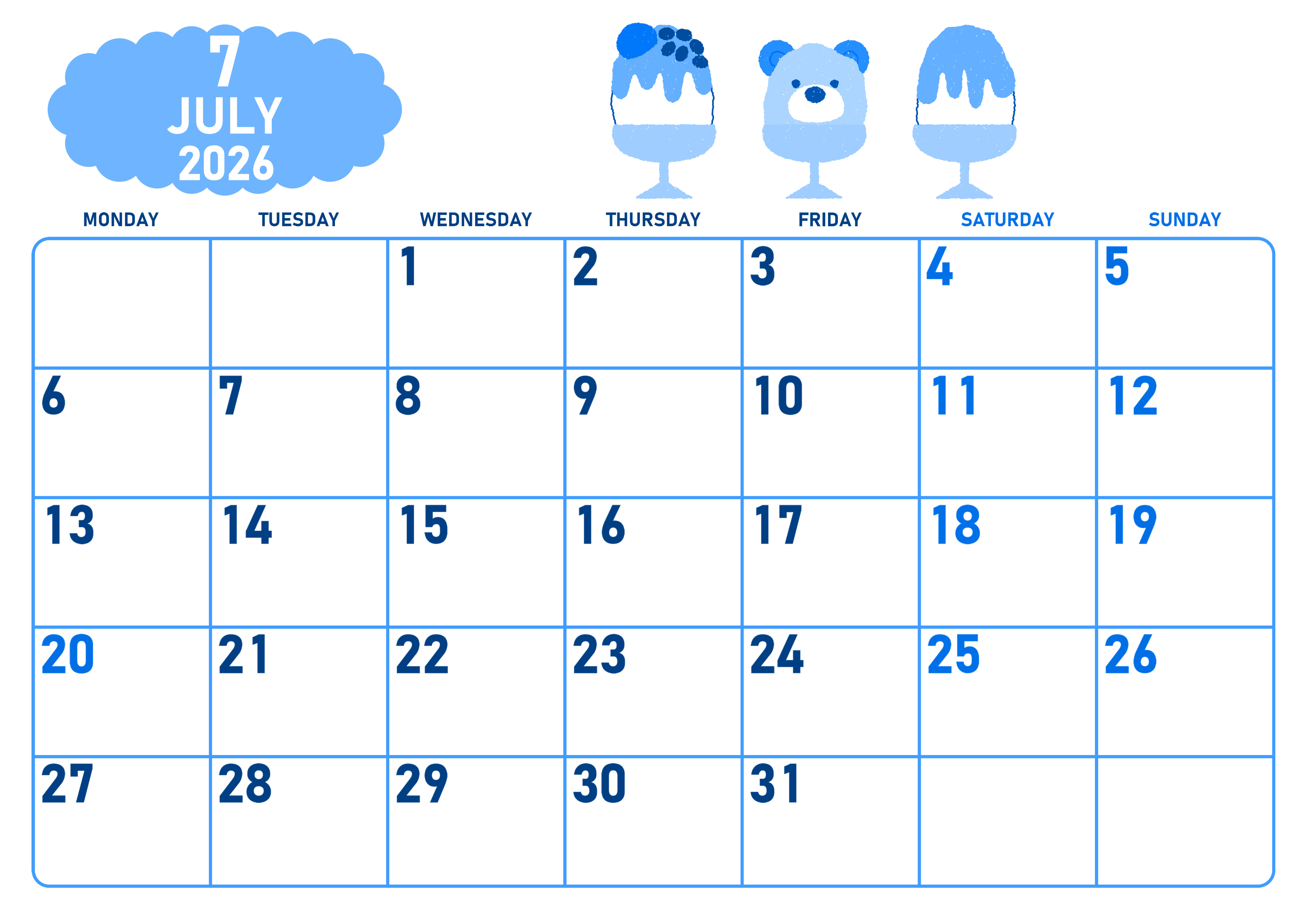 2026年7月横型月曜始まりの無料テンプレートブルーのカレンダーです。月曜始まりで罫線が引かれているのでプランニングに役立つブルーのカレンダーです。イラストは3つのかき氷を起用していて中央のデザインがクマで遊び心もあってかわいいです。(2026-00890701)