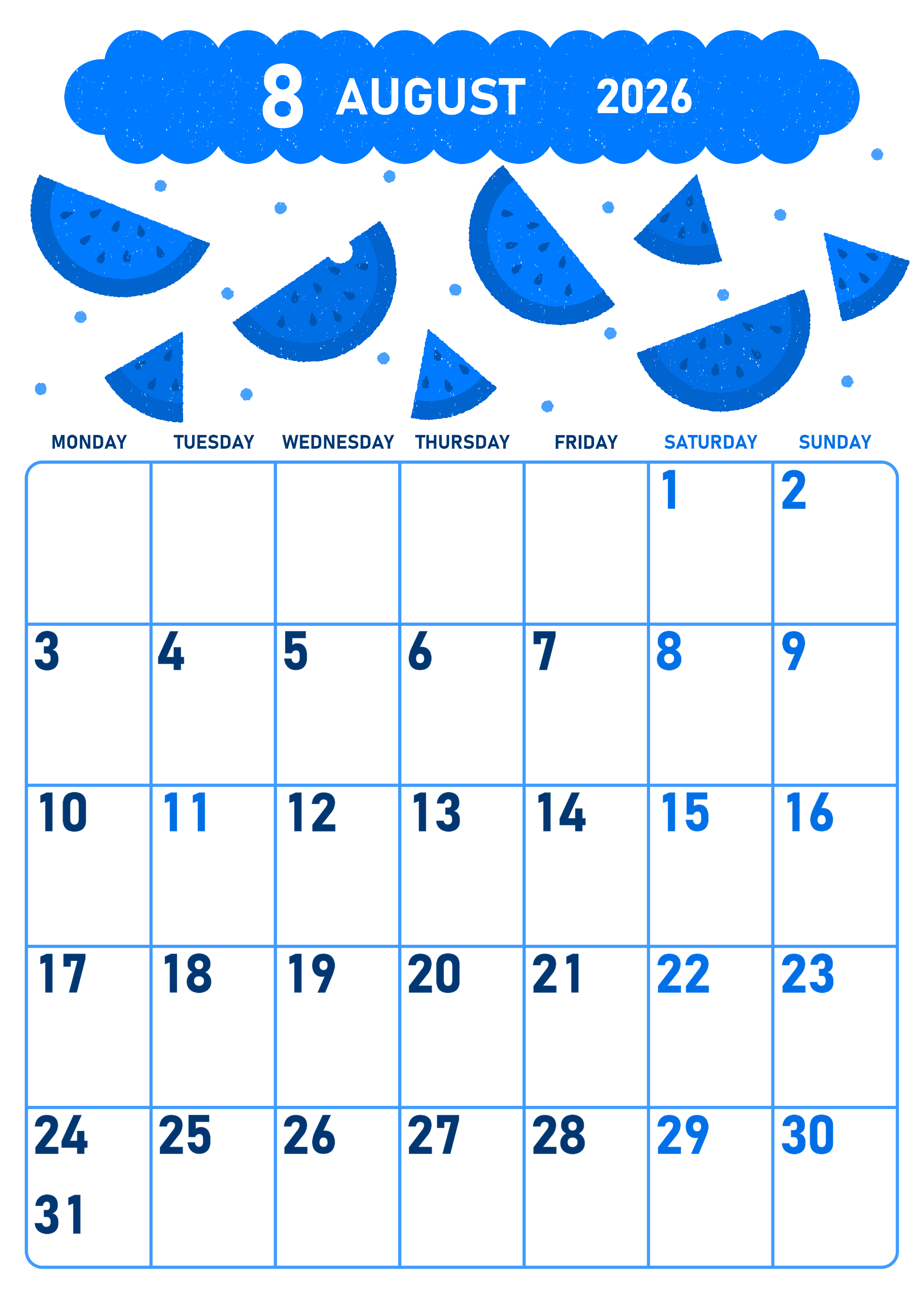 2026年8月縦型月曜始まりの無料テンプレートブルーのカレンダーです。月曜始まりでオリジナルイラストがついている使うのが楽しいブルーのカレンダーです。季節の果物であるスイカがちりばめられていて眺めていて癒されます。(2026-00890811)