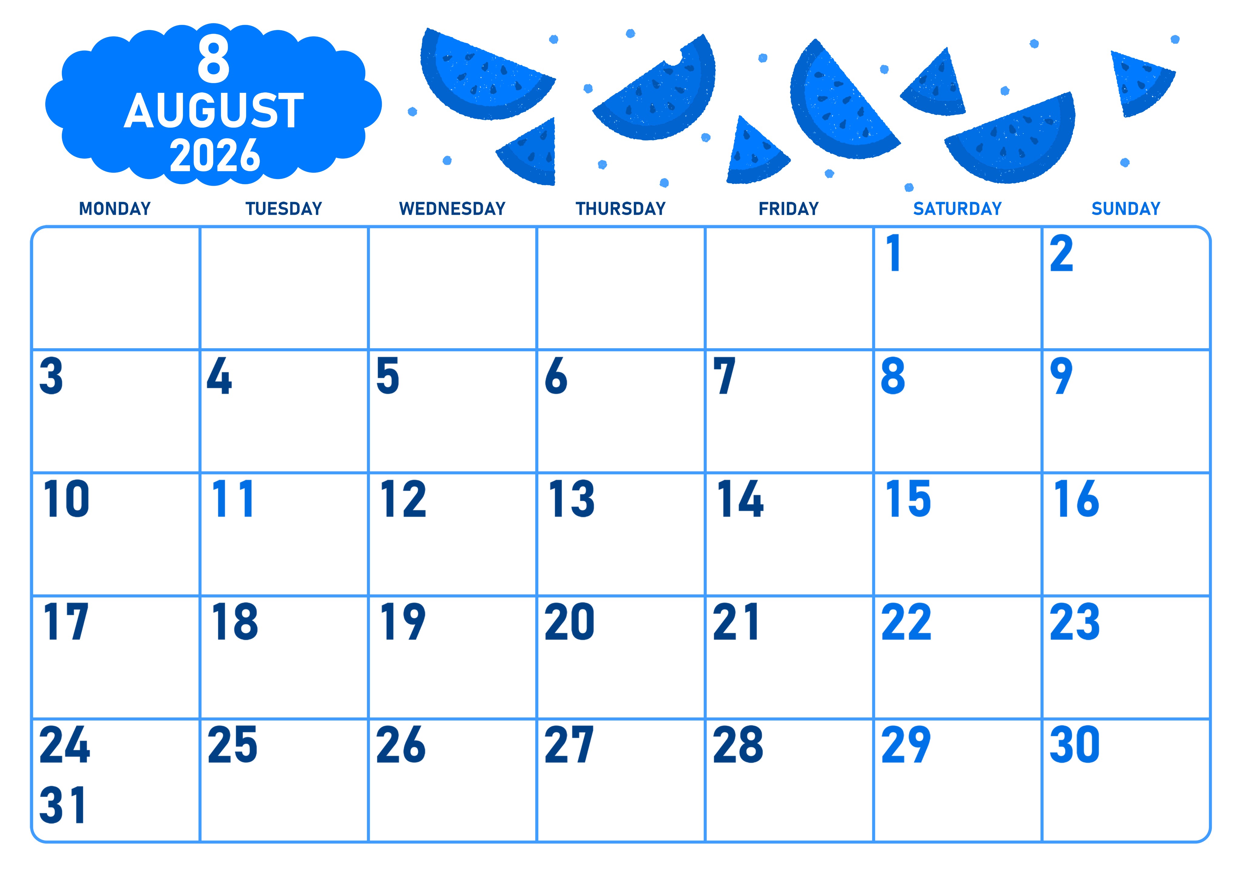 2026年8月横型月曜始まりの無料テンプレートブルーのカレンダーです。夏の季節の果物といえばスイカです。かわいいイラストの中に一口かじられたスイカがいるので探してみて下さい。月曜始まりでA4サイズのブルーのカレンダーです。(2026-00890801)