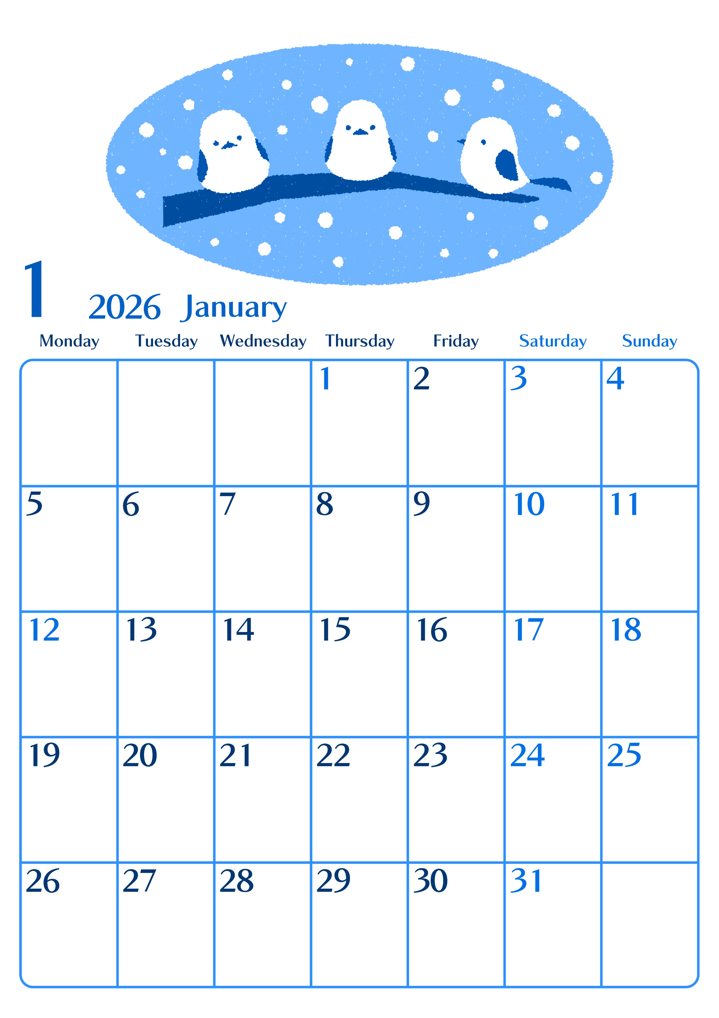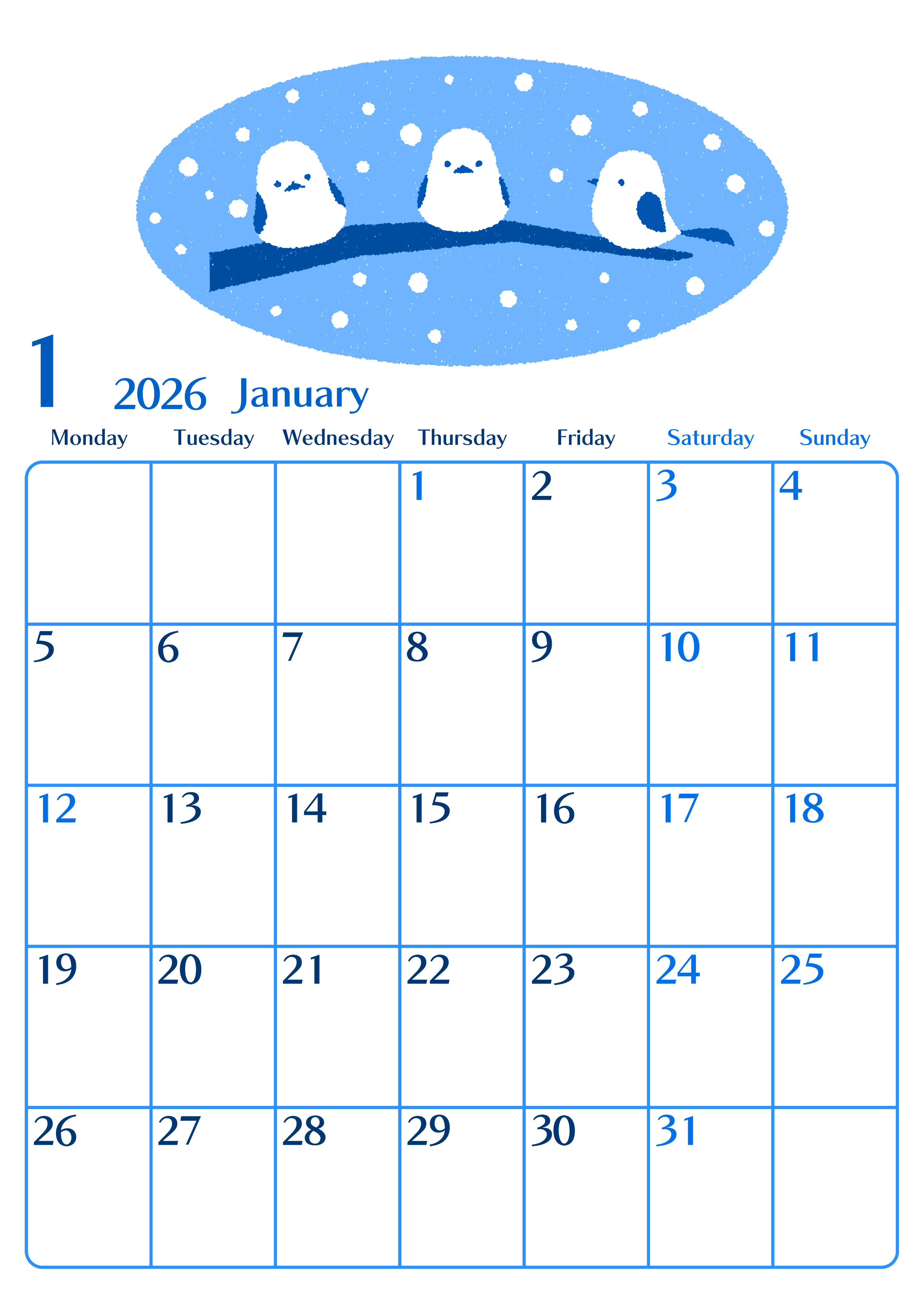 2026年・無料のカレンダーテンプレート 2026年1月縦型月曜始まり イラストのおしゃれA4無料ブルーのカレンダー(2026-00900111) 素材状デザイン王 2025年4月4日 2026年1月縦型月曜始まりの無料テンプレートブルーのカレンダーです。新年のスタートダッシュを気持ちよく切れるようなスッキリ見やすいフリー素材です。(2026-00900111) 1月 縦型のカレンダー 月曜始まり ブルー カレンダーデザイン-0090