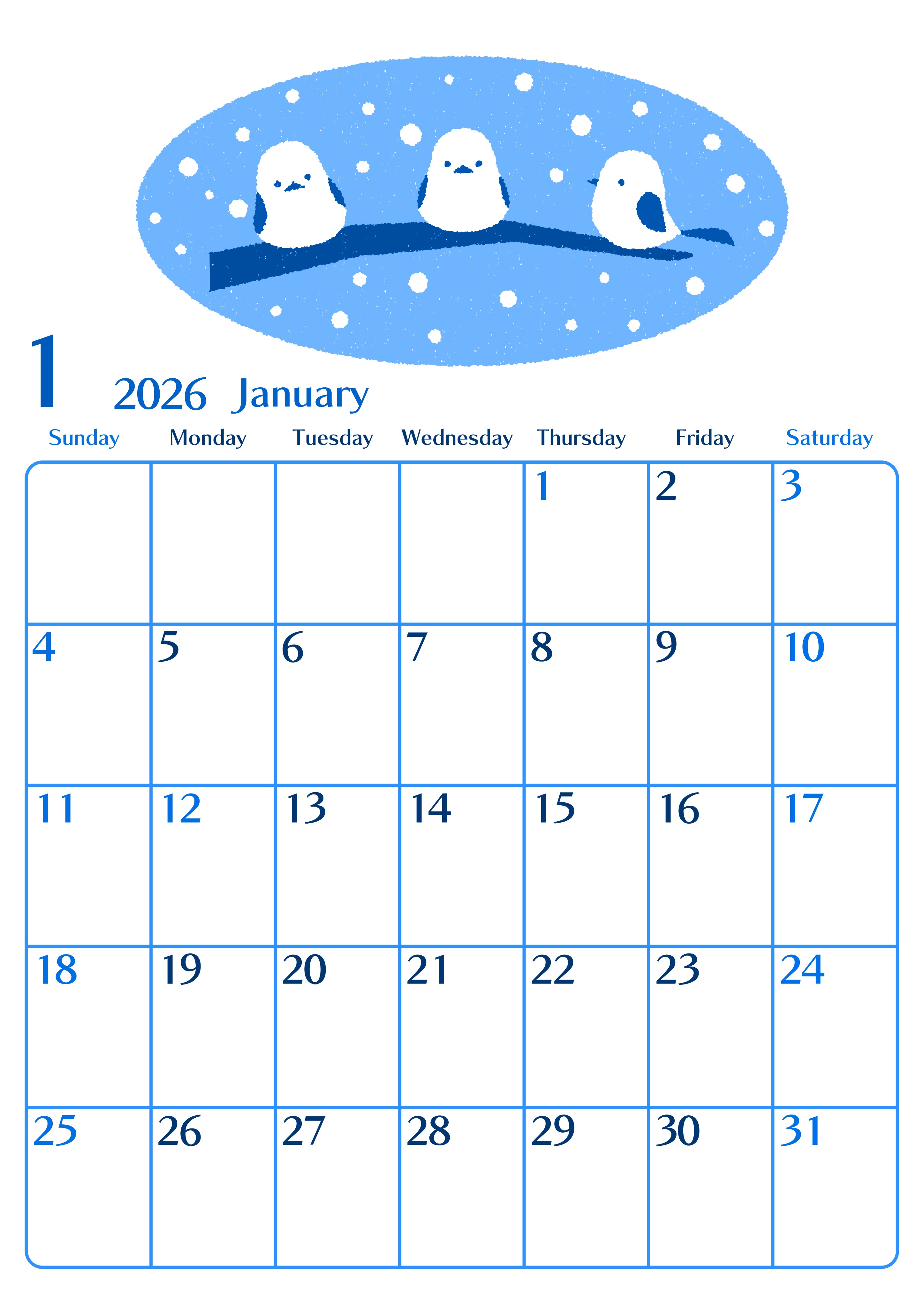 2026年・無料のカレンダーテンプレート 2026年1月縦型日曜始まり イラストのおしゃれA4無料ブルーのカレンダー(2026-00900110) 素材状デザイン王 2025年4月4日 2026年1月縦型日曜始まりの無料テンプレートブルーのカレンダーです。おしゃれなので飽きることなく使い続けられるようなデザインとなっています。(2026-00900110) 1月 縦型のカレンダー 日曜始まり ブルー カレンダーデザイン-0090