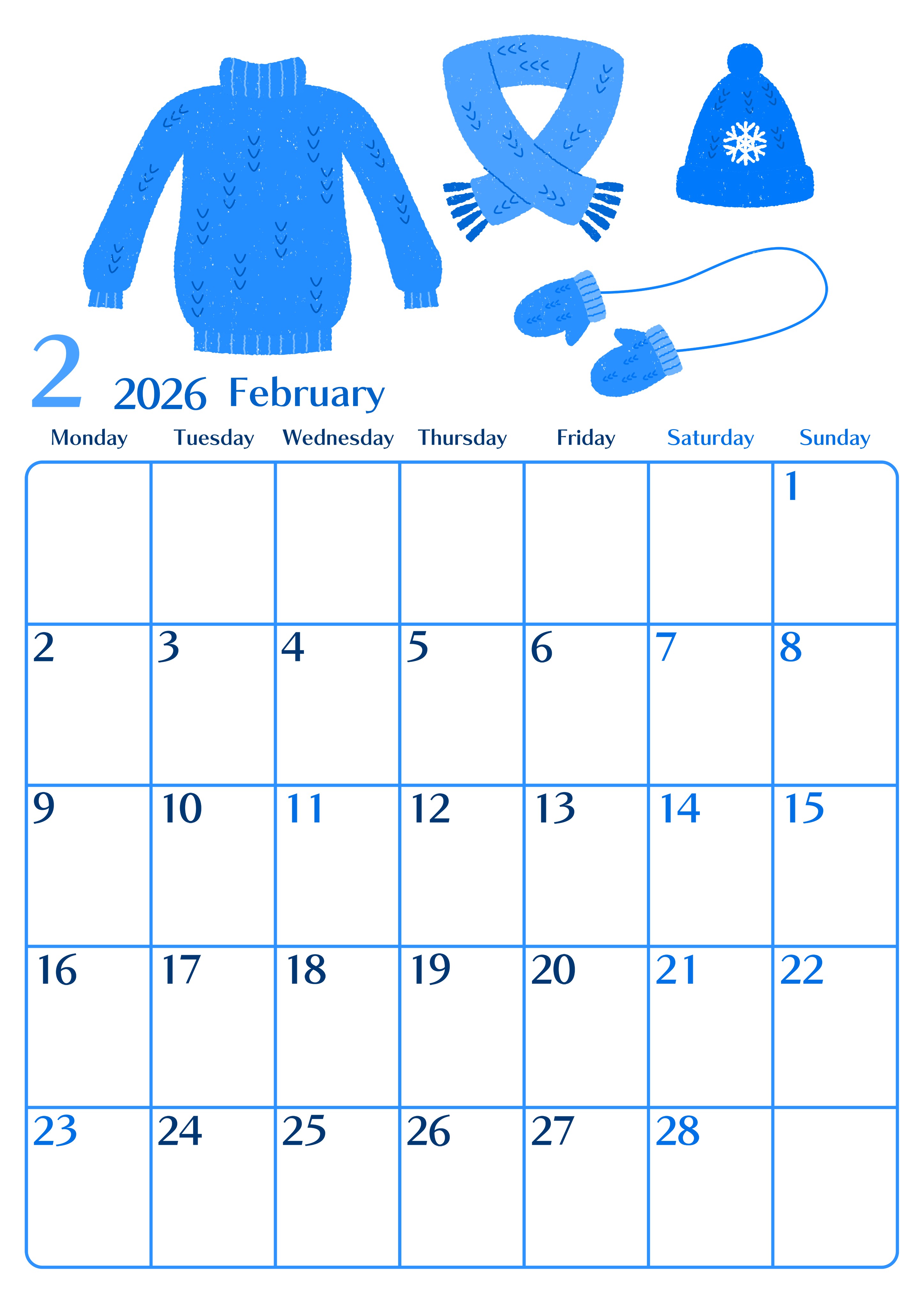 2026年・無料のカレンダーテンプレート 2026年2月縦型月曜始まり イラストのおしゃれA4無料ブルーのカレンダー(2026-00900211) 素材状デザイン王 2025年4月4日 2026年2月縦型月曜始まりの無料テンプレートブルーのカレンダーです。カレンダーに実用性だけでなくおしゃれさも求めている方におすすめです。(2026-00900211) 2月 縦型のカレンダー 月曜始まり ブルー カレンダーデザイン-0090