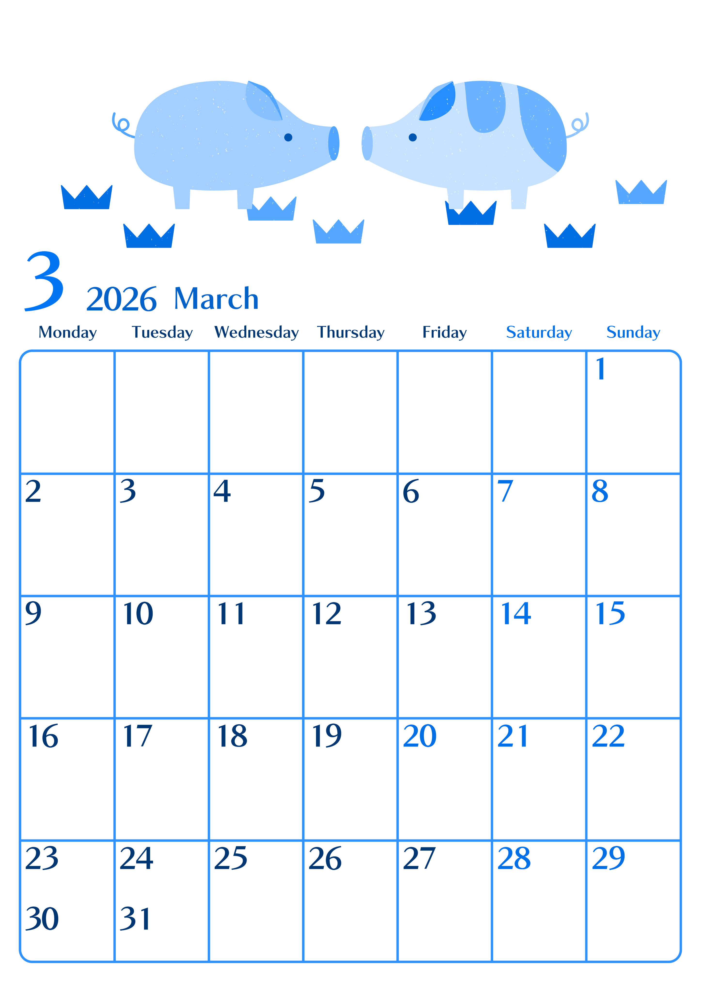 2026年・無料のカレンダーテンプレート 2026年3月縦型月曜始まり 子豚イラストのおしゃれA4無料ブルーのカレンダー(2026-00900311) 素材状デザイン王 2025年4月4日 2026年3月縦型月曜始まりの無料テンプレートブルーのカレンダーです。目に優しいおしゃれなデザインのイラストとなっています。ブルーのカレンダー部分は余白がたっぷり設けられているので見やすいです。(2026-00900311) 3月 縦型のカレンダー 月曜始まり ブルー カレンダーデザイン-0090