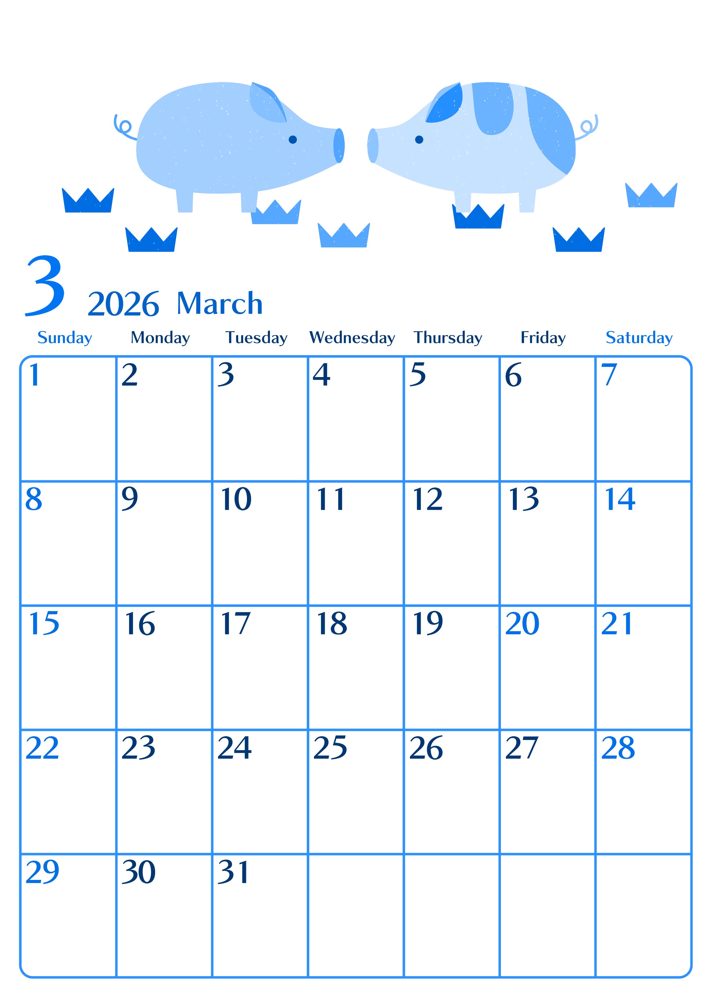 2026年3月縦型日曜始まりの無料テンプレートブルーのカレンダーです。癒し系な自然と動物をテーマにしたおしゃれですっきりとしたシンプルブルーのカレンダーです。書き込みしやすいレイアウトなのでおすすめします。(2026-00900310)