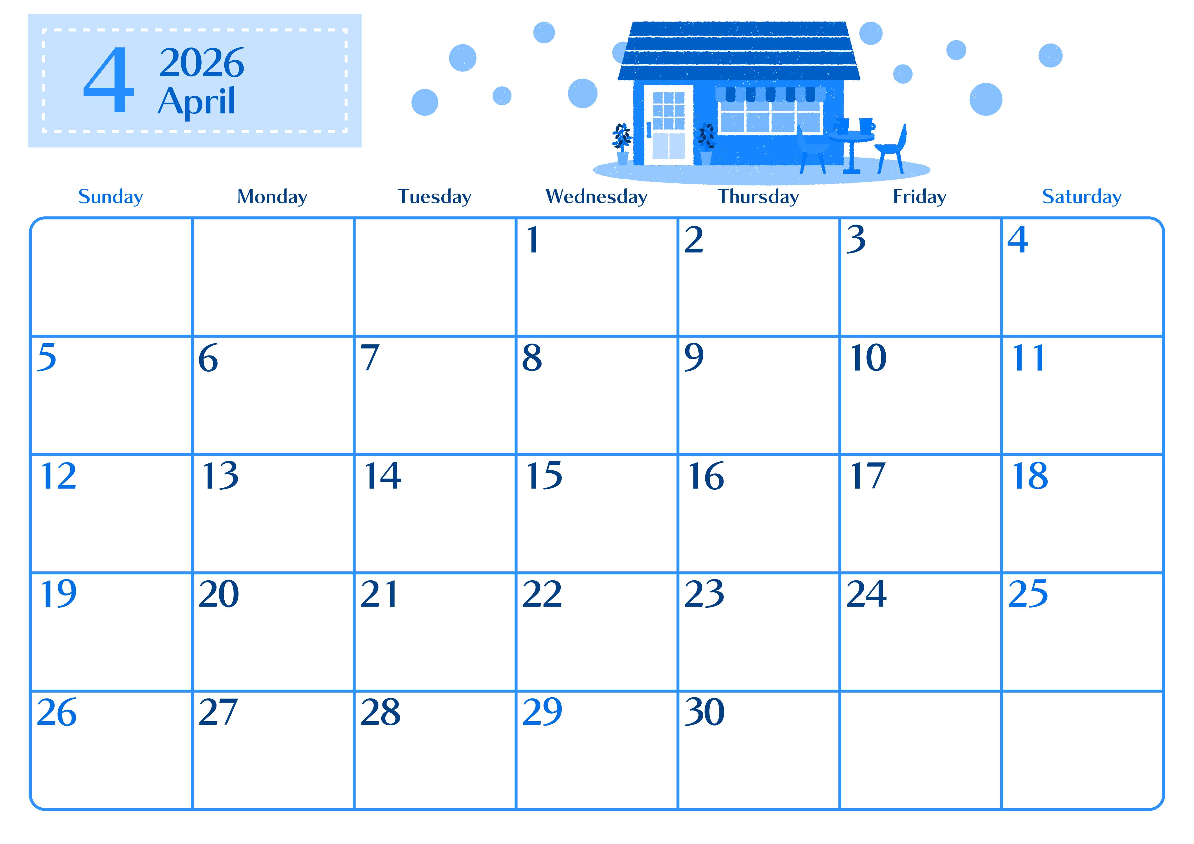 2026年4月横型日曜始まりの無料テンプレートブルーのカレンダーです。新生活を連想させるシンプルでありながらもおしゃれで使い勝手の良い見やすいレイアウトのイラストブルーのカレンダーです。罫線もシンプルおしゃれです。(2026-00900400)