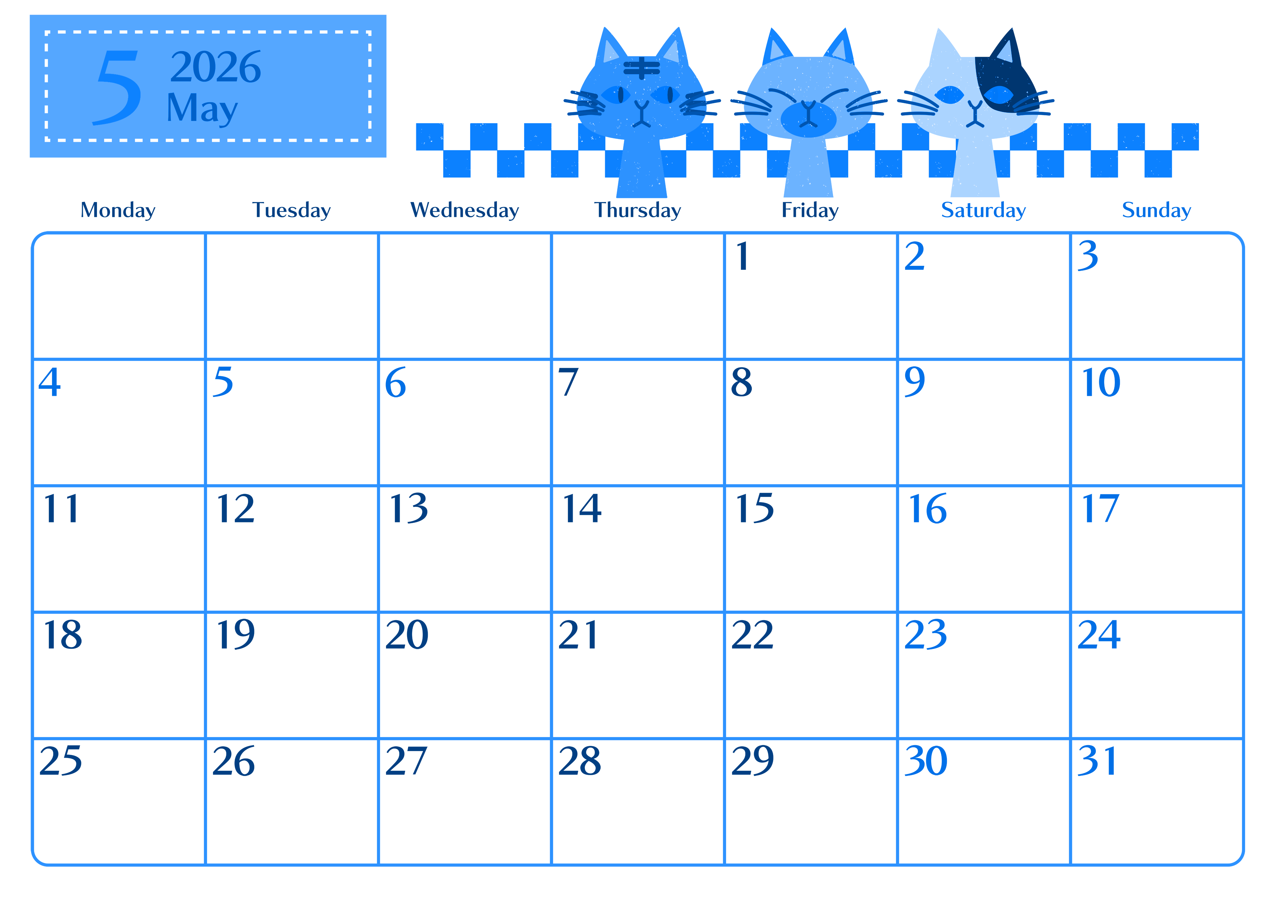 2026年5月横型月曜始まり 猫たちイラストのおしゃれA4無料ブルーのカレンダー(2026-00900501)