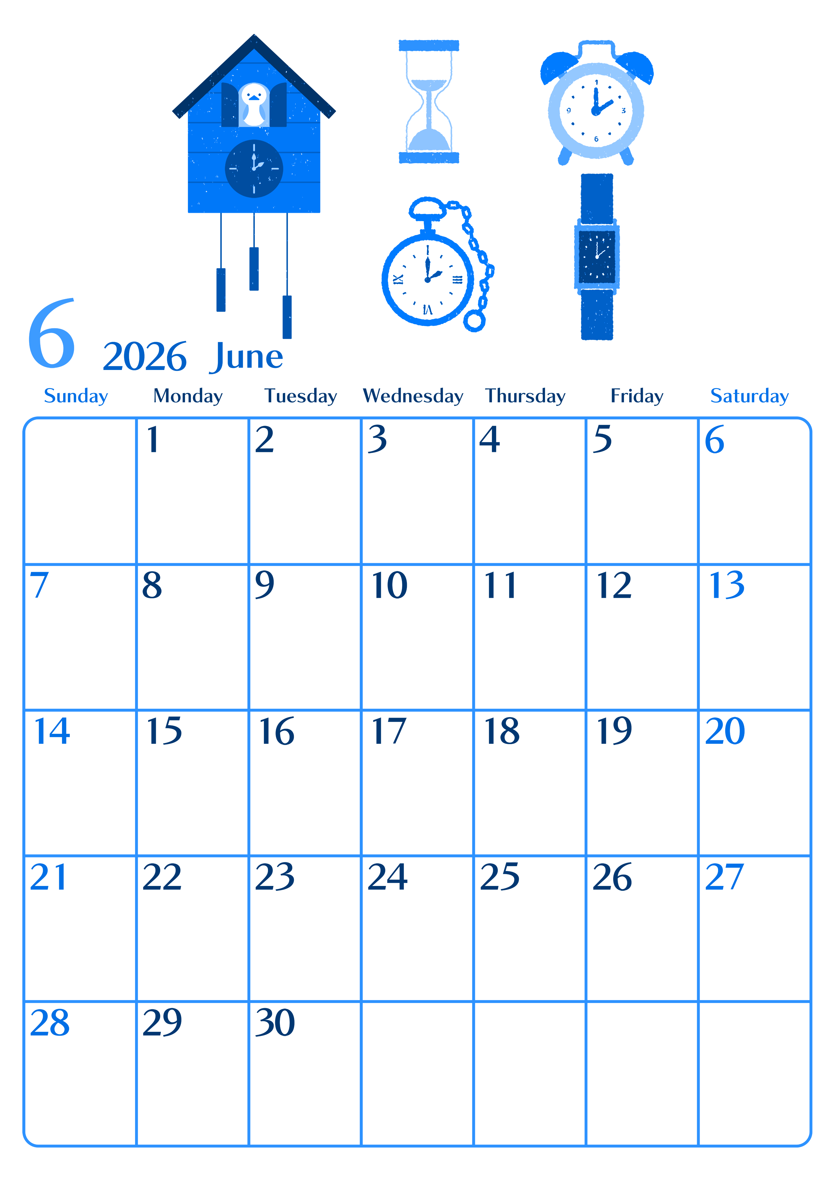 2026年6月縦型日曜始まりの無料テンプレートブルーのカレンダーです。砂時計や腕時計や掛け時計、あなたはどのタイプの時計が好きですか?おしゃれで縦型イラスト付きのブルーのカレンダーなので壁に貼って使うのをおすすめします。(2026-00900610)